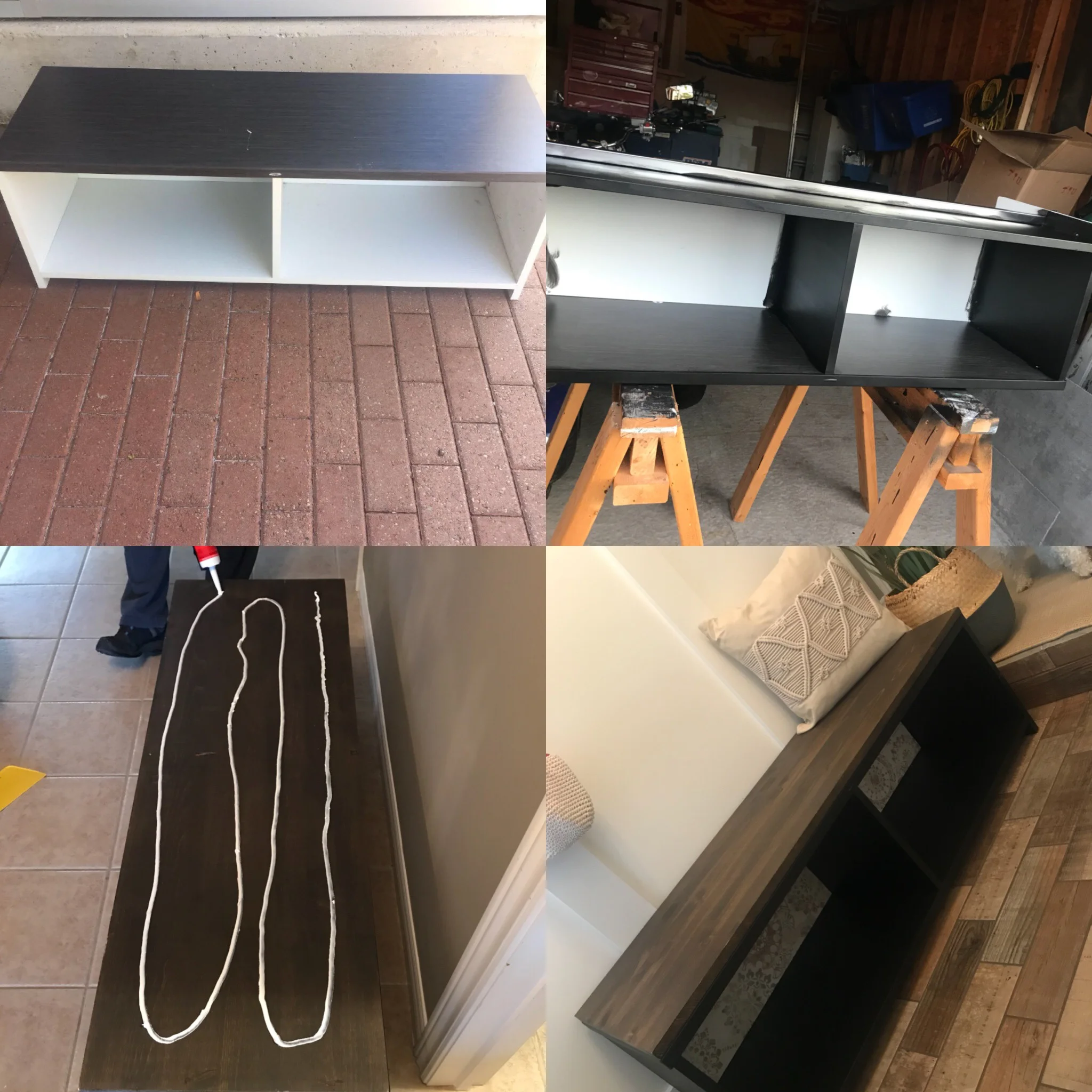 You’ve also heard me mention more than once, a built in bench in our entryway as part of this challenge. Being the newbies that we are in the laying tile and doing board and batten department, last week we felt we were running out of time and decided to put the built in part of the bench on the back burner. I already had a slab of pine that I had also stained with the same SFO in Cappucino and I had to somehow, come up with a solution ASAP! Said slab was a fairly standard size piece of pine from Home Depot, cut at 48x16. So I spent an hour scrolling my local buy and sells looking for something I could use for a base. I finally got lucky and the next morning my son and I went and picked this beast up, it was solid as a rock (even though it is a wood/mdf combo piece) and other than a thick layer of dust, it was in mint condition.