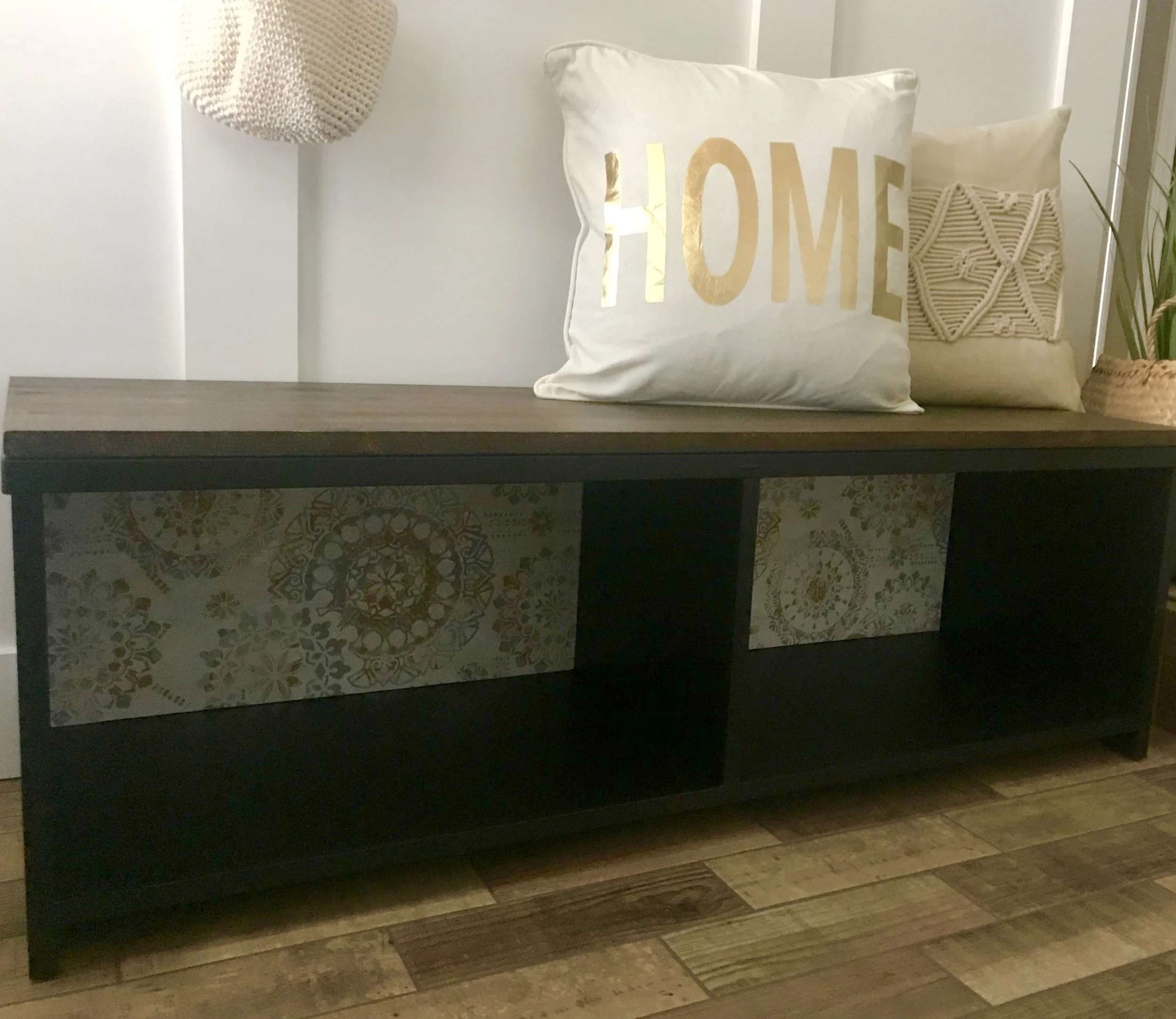 I brought it home, cleaned it, gave it a coat of Ultra Grip and the base took 3 coats of Fusion Coal Black for good coverage. It was left to dry and cure and a couple of days later we attached the pine slab to the top and I tell you, it was nothing short of fate that had it being the perfect fit. Before we attached the pine with some liquid nail and staples, I wallpapered the back of the two inserts in the bench with paper we had leftover to add a pop of colour . This piece turned out better than I ever expected, especially considering it was a last minute change in plans and I was basically starting from scratch!