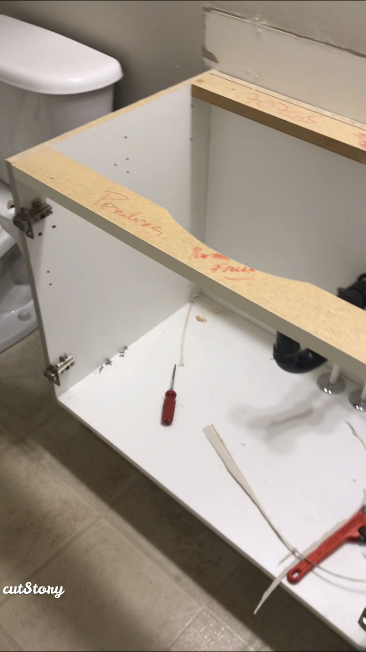This poly-marble countertop was purchased with a gift card I won from Bath Depot and only ended up costing me only $13! You can’t get much thriftier than that. And this beautiful matte black faucet from Home Depot is the perfect finishing touch. I love perfectly stark contrast it makes against the white countertop.