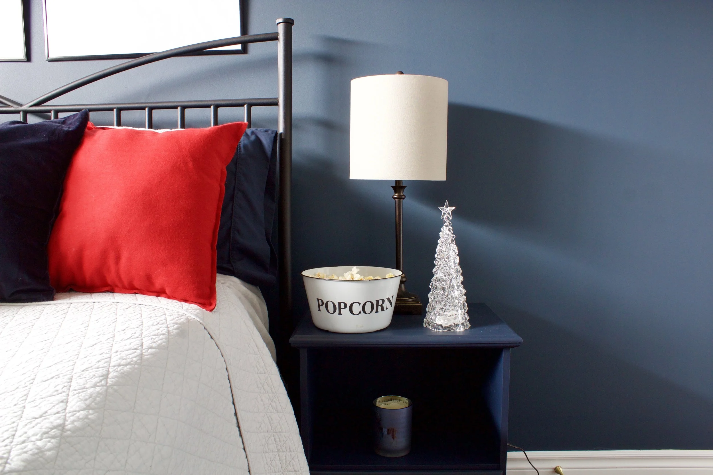 Before I got started, I took an inventory of our guest room because I always like to work with what I have in a space when sticking to a budget, because let’s face it, Christmas is a very short season, even when you decorate early like me! The walls in this room are painted a beautiful navy blue (Sea Serpent by Sherwin Williams) and the bedding is a very light gray so I knew I could easily incorporate some simple, budget friendly ideas because honestly, who doesn’t love a blue Christmas? I’ve had blue Christmas themes in the past so I already had a few things on hand to incorporate into the space