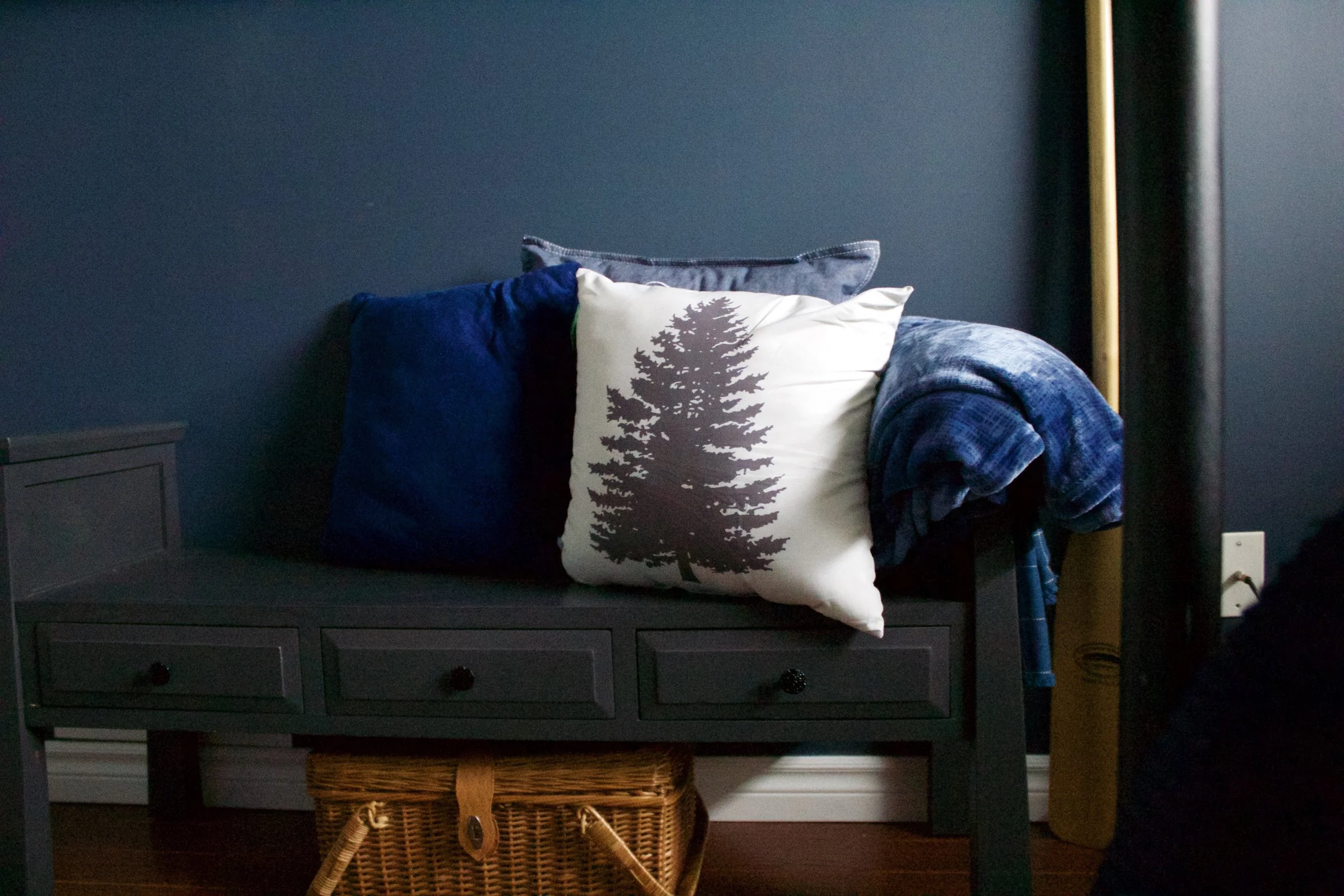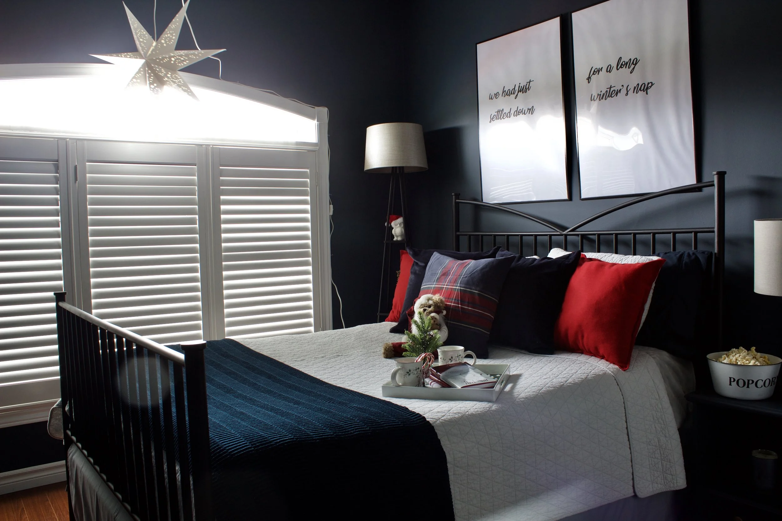 One of my most favourite money saving decor tips is to buy throw pillow covers and my favourite place to buy them is Ikea, where they are affordable and durable. For this room, I already had two navy blue pillow covers from Ikea in our living room so I brought them into the guest room, I had these read ones in my Christmas decor bins and I purchased this cute plaid one at Ikea for $13.99. I put it over an old throw pillow and voila, Something as simple as changing out your throw pillows can change the look or design of an entire room. We all know throw pillows can be pricey so I definitely recommend pillow covers (they’ve even had some cute ones at Dollorama this year).