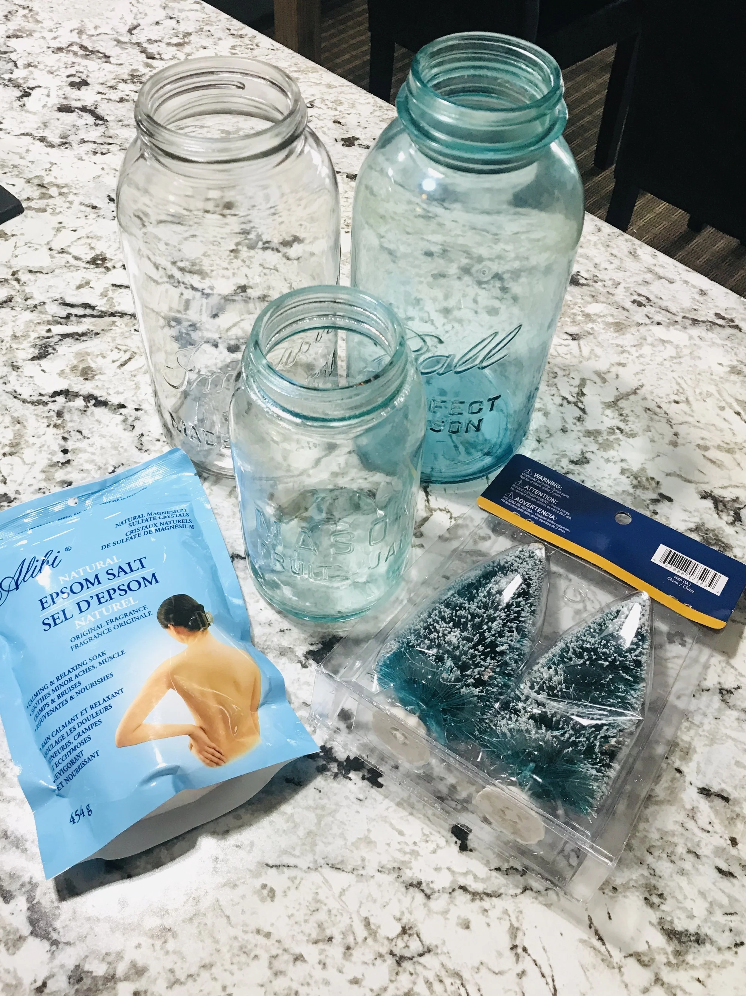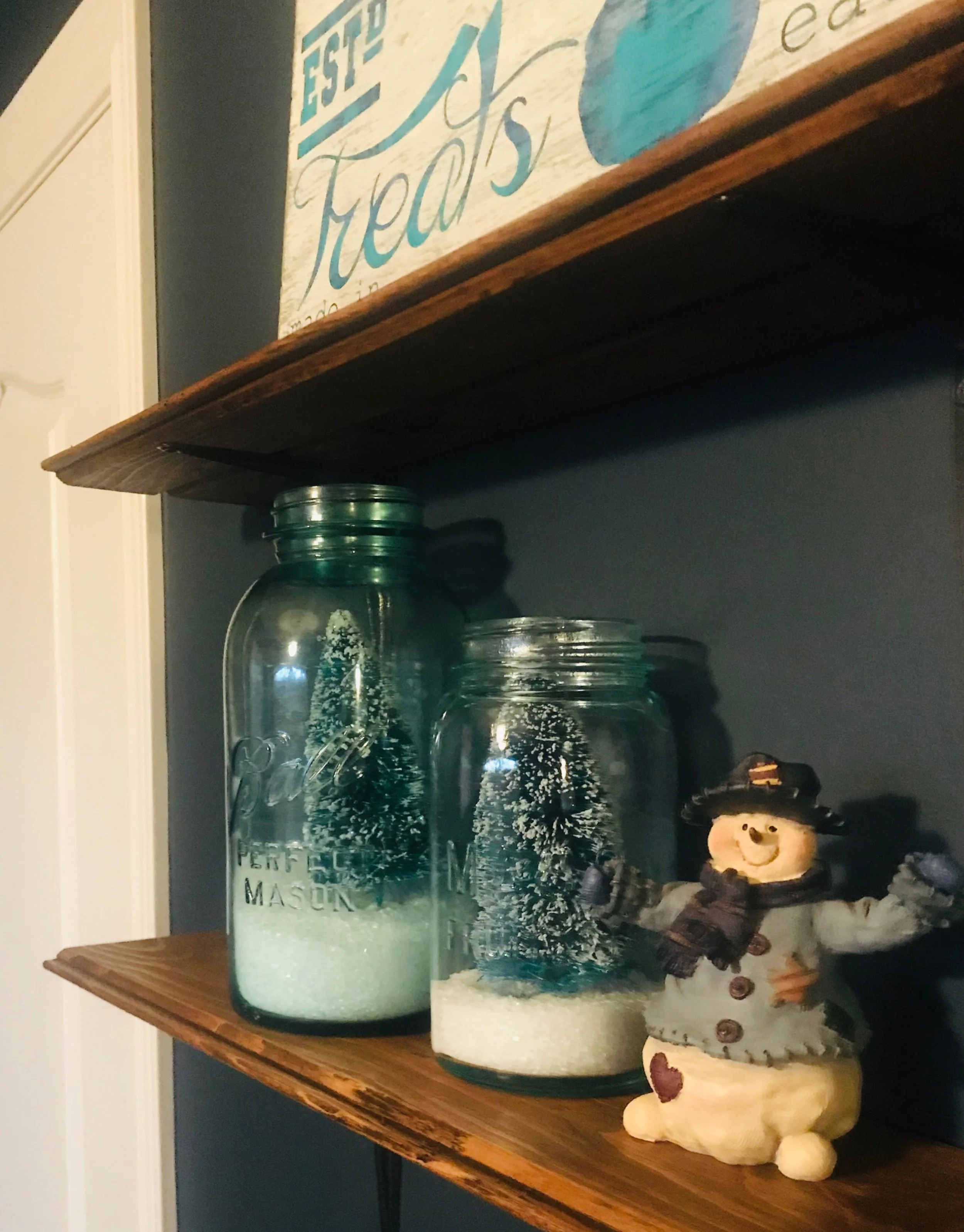 I wanted to add some “wintery” decor to the open shelving we put in this room earlier this year so I decided to use this tried and true mason jar craft and it’s the perfect addition. I bought the wire brush trees and the epsom salts at the dollar store, the jars I had in my collection. Another easy and affordable way to add a little Christmas to any room!