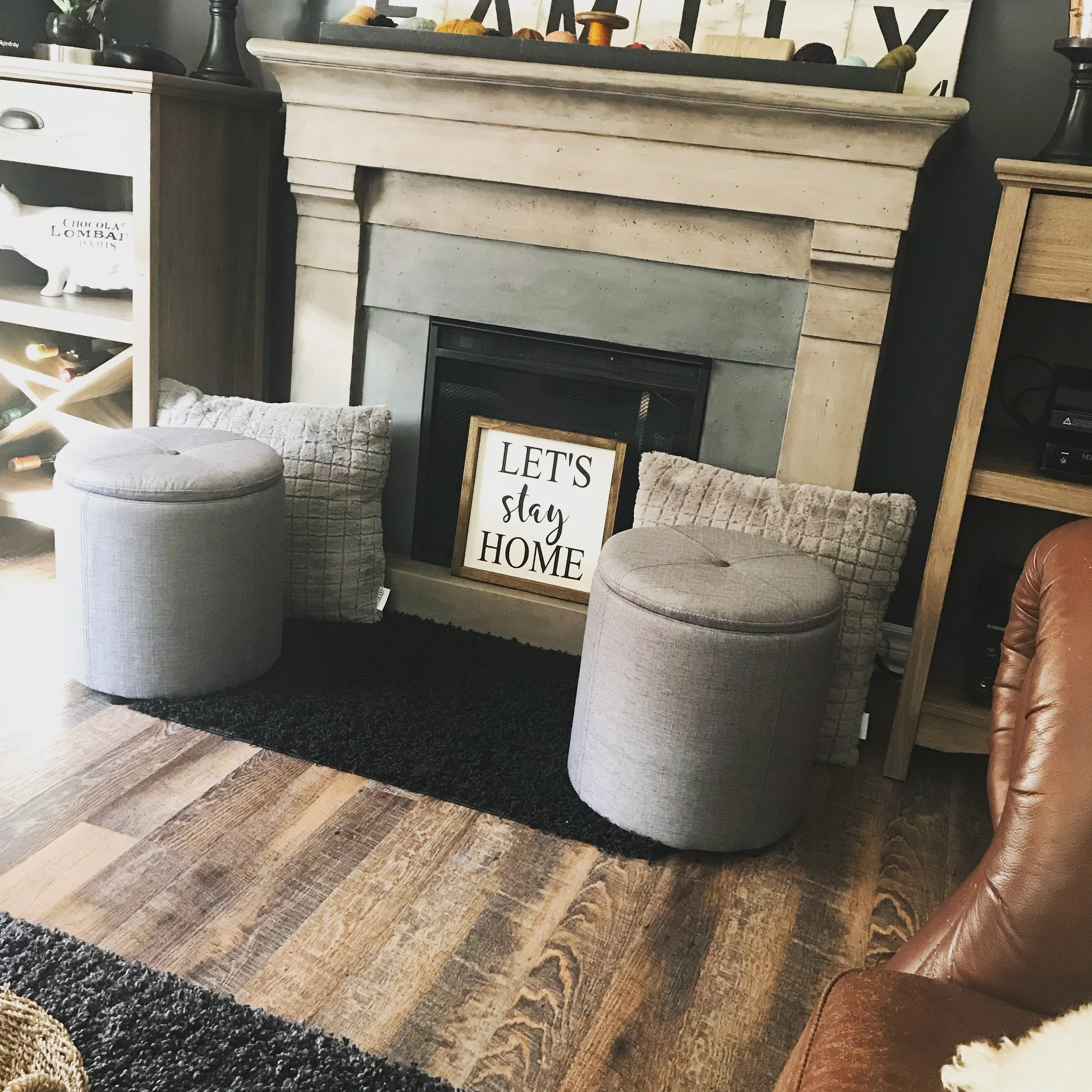 We bought this fireplace when we moved into our bungalow, at Costco Online and it is made from a concrete like material. We actually thought it was the perfect size but after it was delivered it looked a bit dwarfed by the 9 foot ceilings and the big ass tv. Add to the fact that I can't do much along the lines of mantle decor without blocking the precious telly made for a much needed update. We decided to keep it because it was unique in it's look compared to all the others we had looked at. We have toyed with doing built-ins down the road, in which case they would be scaled to include the size of the fireplace. But that's a whole other topic/DIY for another day waaaaaay down the road!