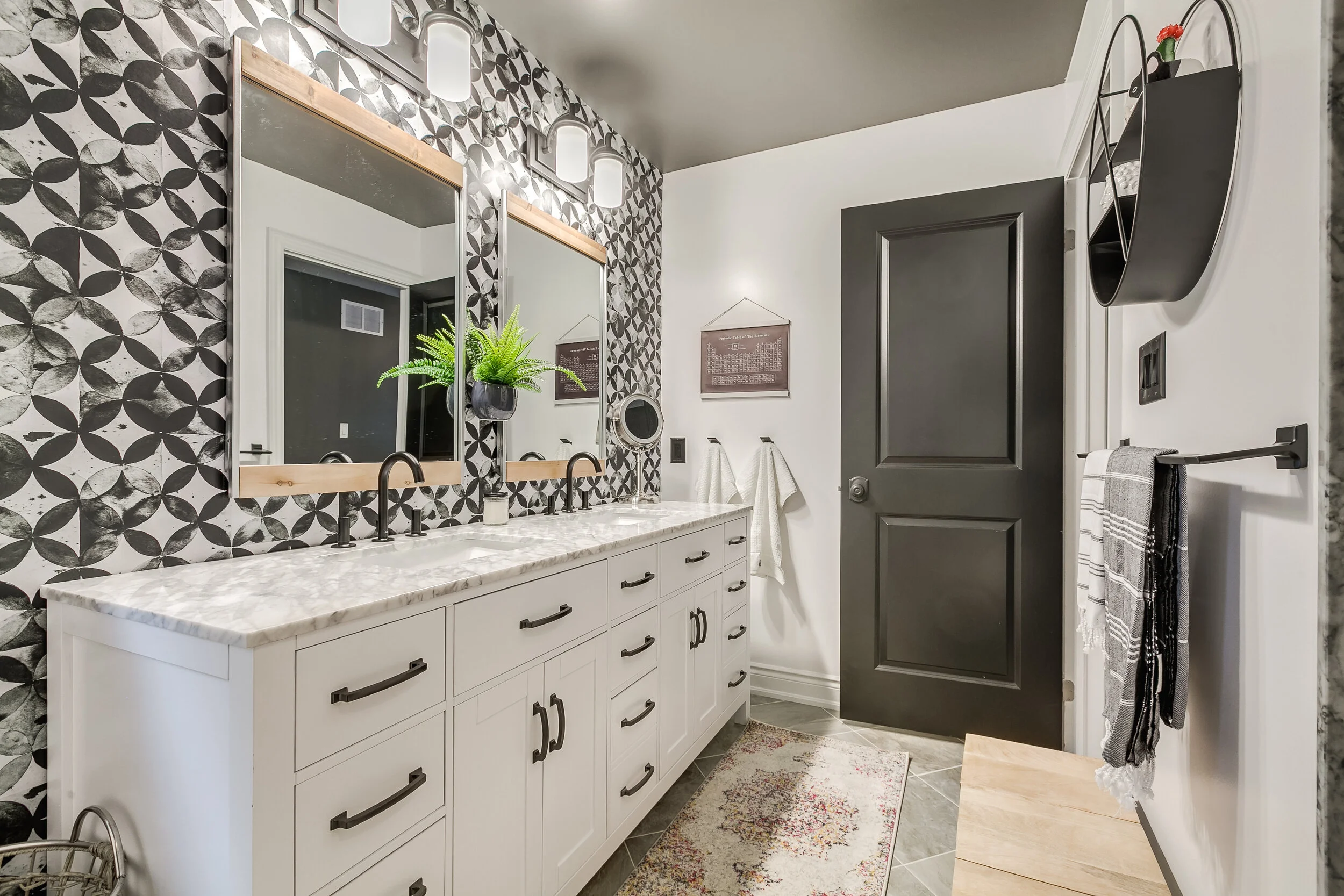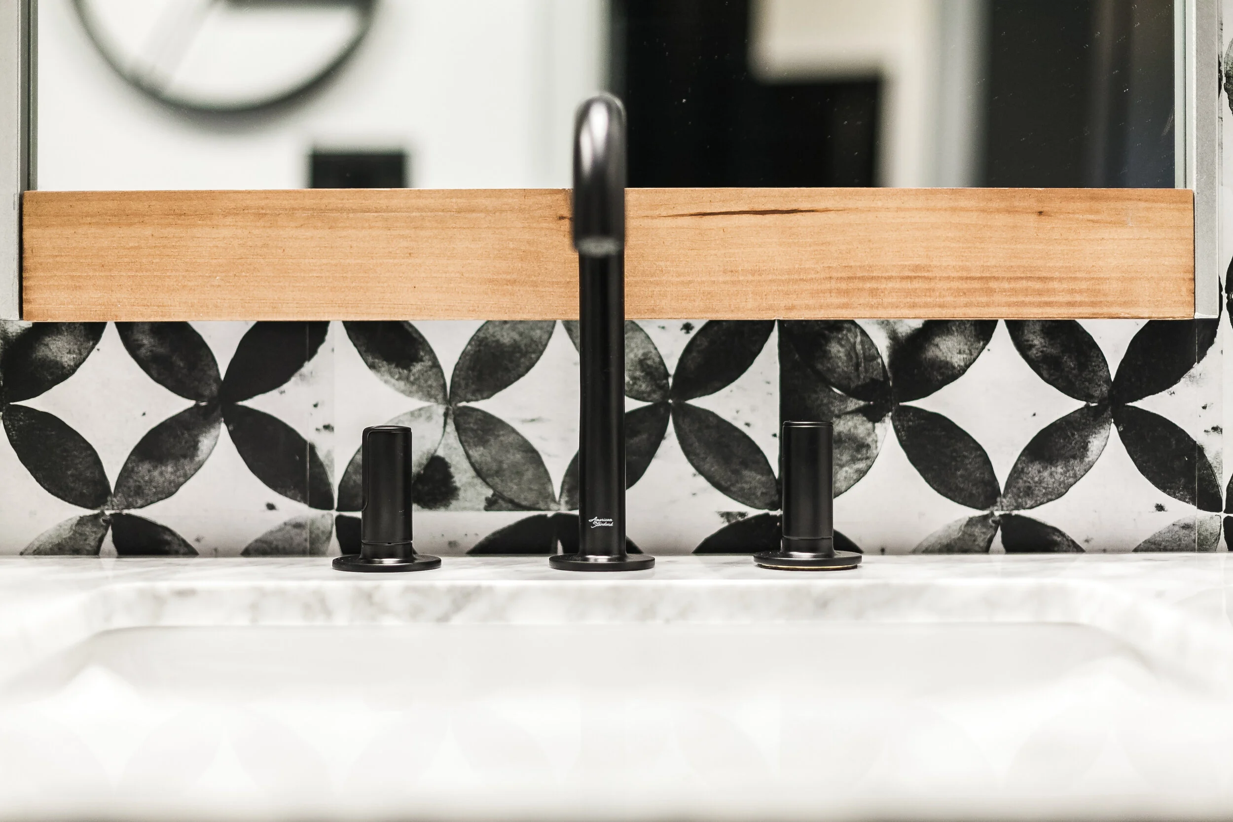 First up have our new vanity that is the perfect height with soooooo much storage, double sinks which means double beautiful matte black faucets that we are OBSESSED with. They are from American Standard’s Studio S Line and they are sleek and functional and certainly make a statement.