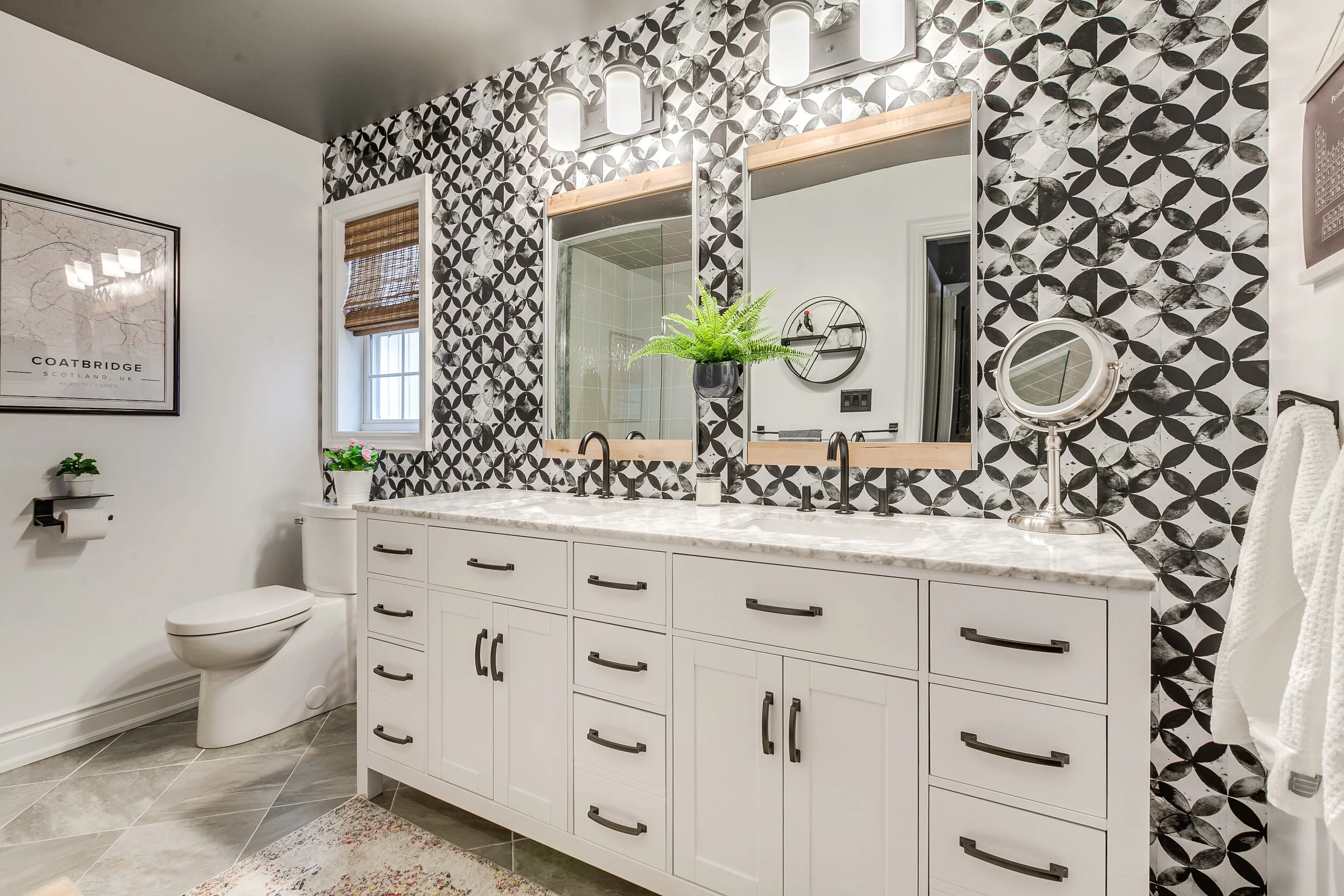 As I’ve been sharing sneak peeks of the bathroom I keep getting asked where we got the tile on the accent wall behind the vanity. You guys it’s not tile , it’s PEEL AND STICK WALLPAPER! OMG!!!! I know, I still can’t believe it either. It’s from Roommates Decor (where all my peel and stick wallpaper comes from) and is part of their new Paul Brent line. Isn’t it stunning? And it definitely resembles tiles, in fact it is called “Moroccan Tile” and for you colour loving people, it also comes in a beautiful dark green or a vibrant blue.
