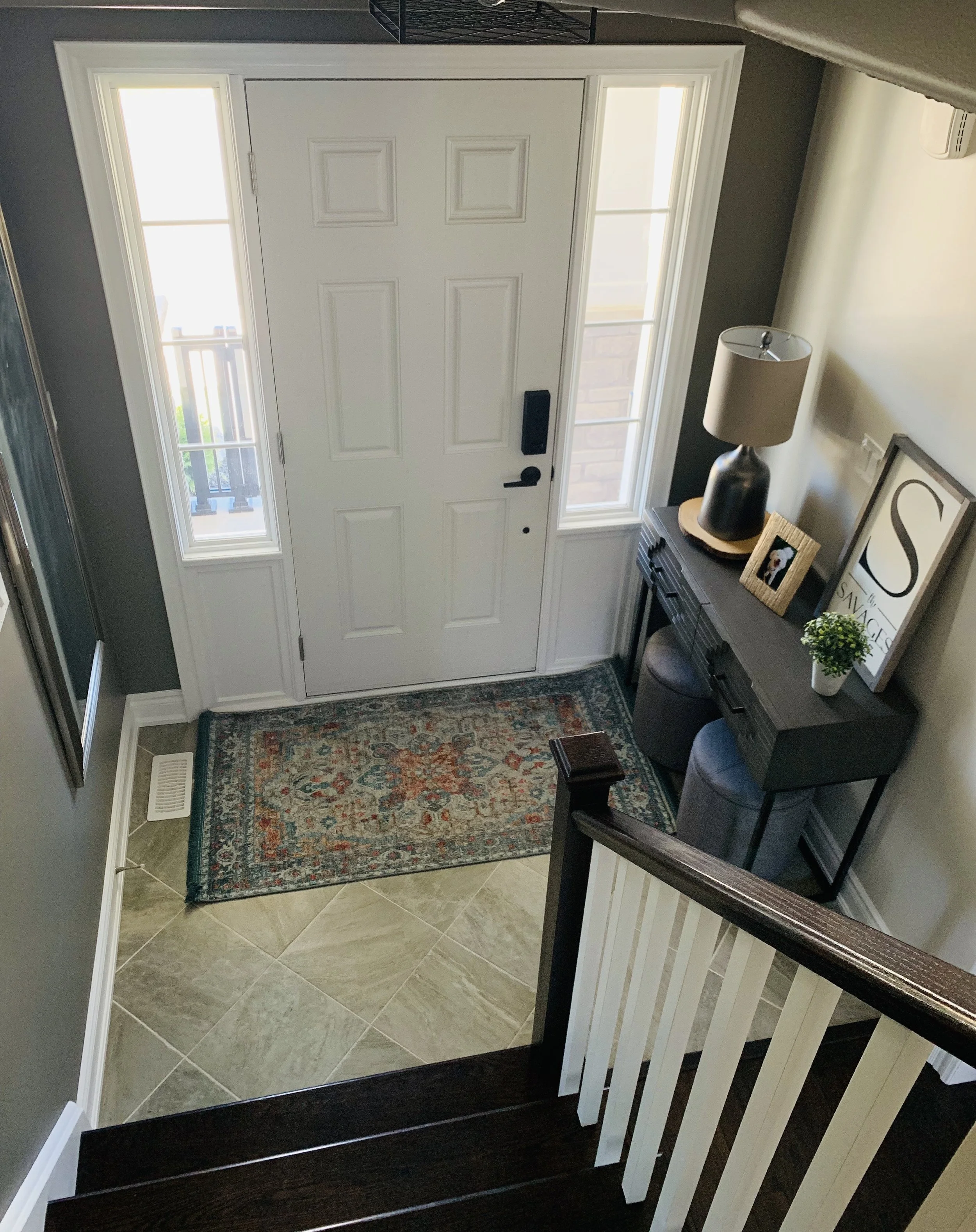 I decided to transition from our lighter main floor colour which is BEHR MARQUEE® “Off White” PPU-73 to this new “Wet Cement” colour around our front door and continue up the stairs into the loft. All I can say is we love it; it was definitely the best pick for this space. It has made this room cozy and warm which is exactly the vibe I was going for.
