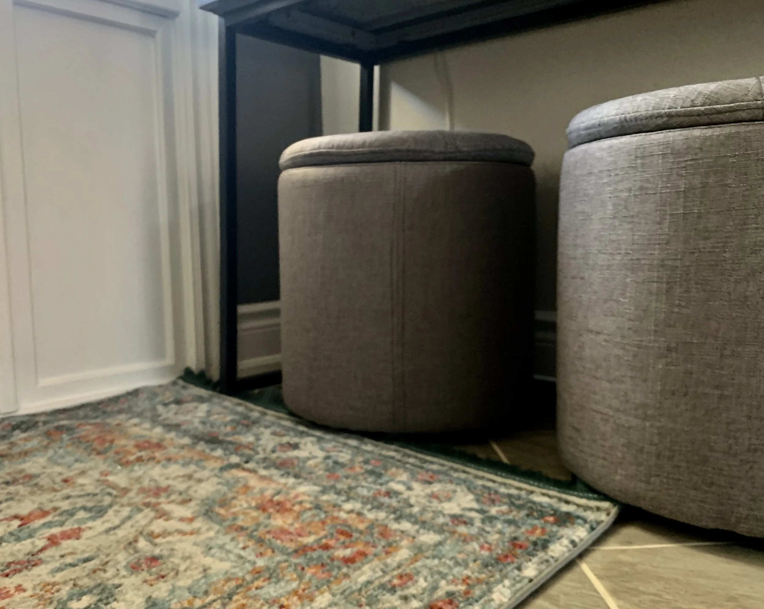 Of course I knew I wanted to keep things in the gray family, (shocking I know)! I picked up several paint chips at my local Home Depot, wanting to ensure my choice tied in well with both the ceramic tiles in the entryway as well as the wood risers on the stairs. I ended up choosing BEHR MARQUEE® “Wet Cement” and I absolutely love it. To my eye, it is a cross between dark grey and dark green, it is bold and rich, the perfect addition to my dark colour palette. We continued using the Eggshell finish which we know first hand to be super durable and easy to wipe clean, both important attributes for painting an entryway.