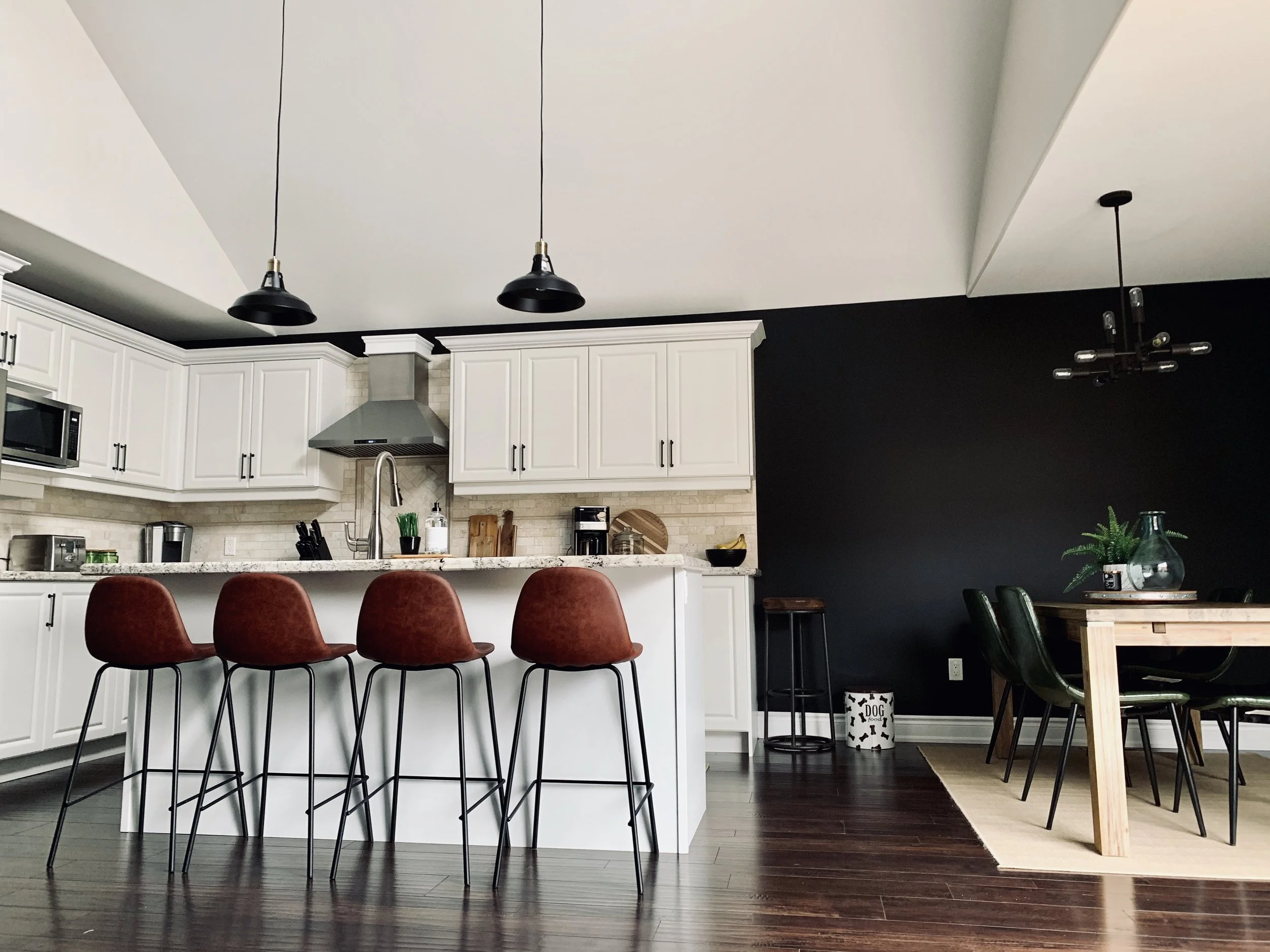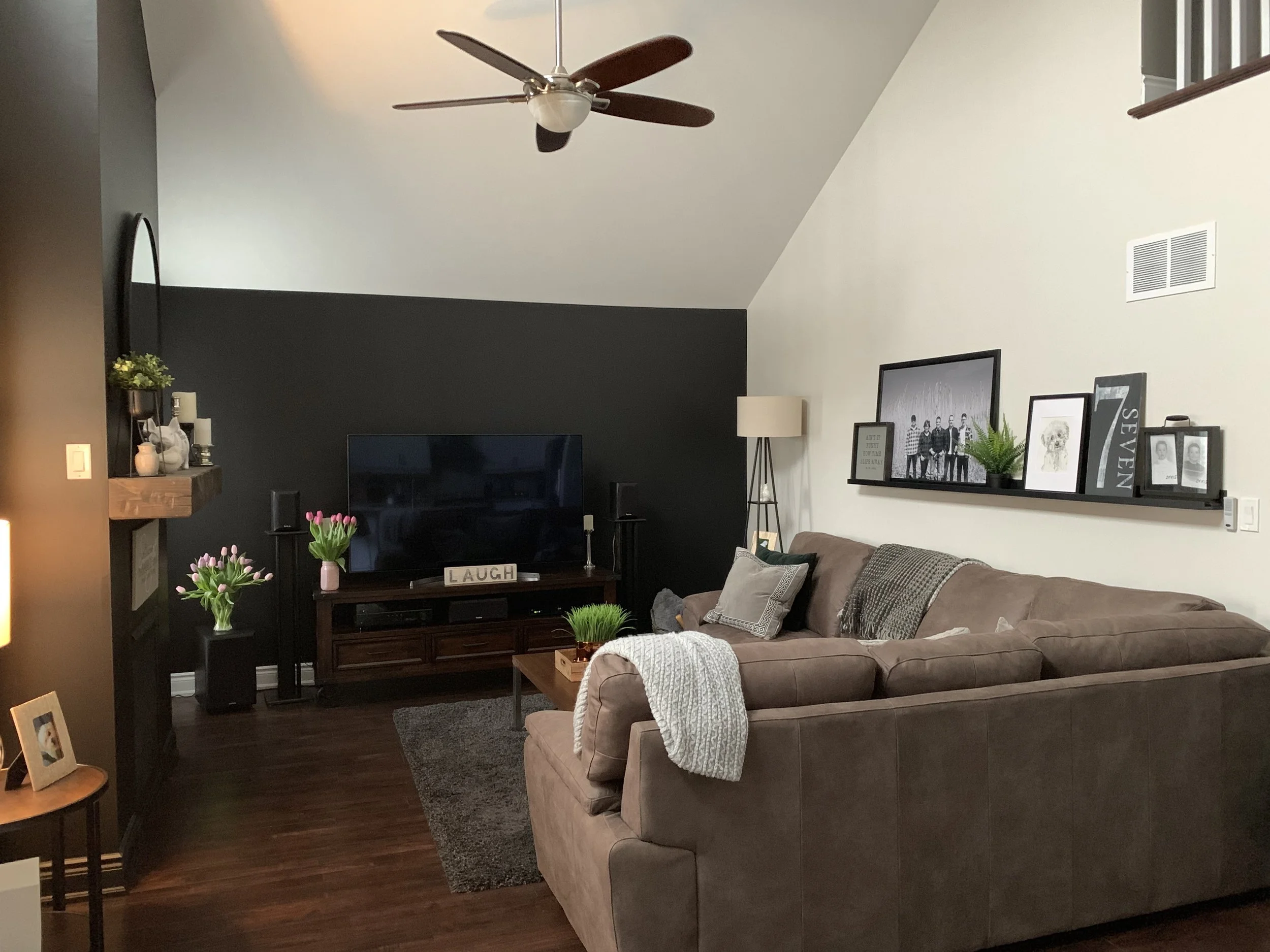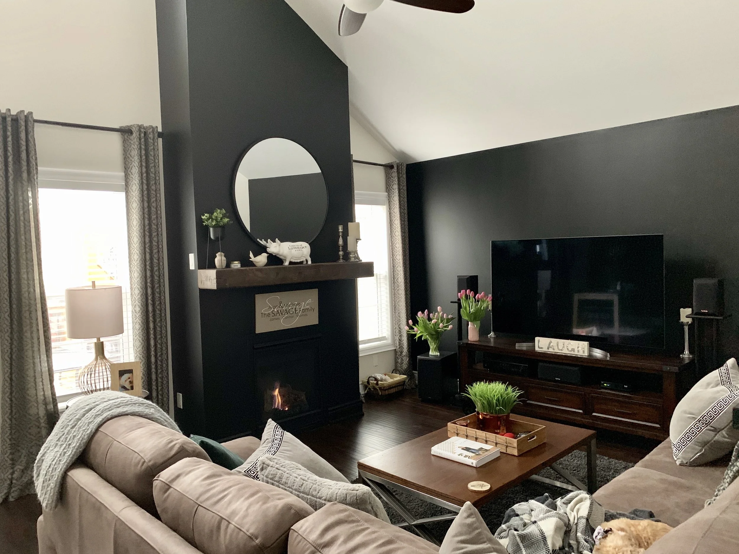 And here is the after, two coats of BEHR MARQUEE® “Limousine Leather”(MQ5-05) and she is stunning from top to bottom! We went on to paint an accent wall in our kitchen in “Limousine Leather” and because we loved it so much and felt like the vaulted ceilings enabled us to go big or stay home, we also did an accent wall in the living room. The rest of this large common space was painted out in BEHR MARQUEE® “Off White”(PPU-73), it has the softest, warmest undertones and compliments the black accents perfectly.
