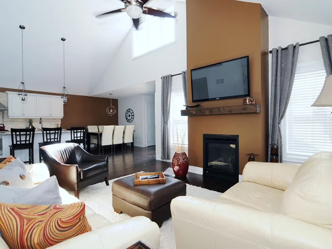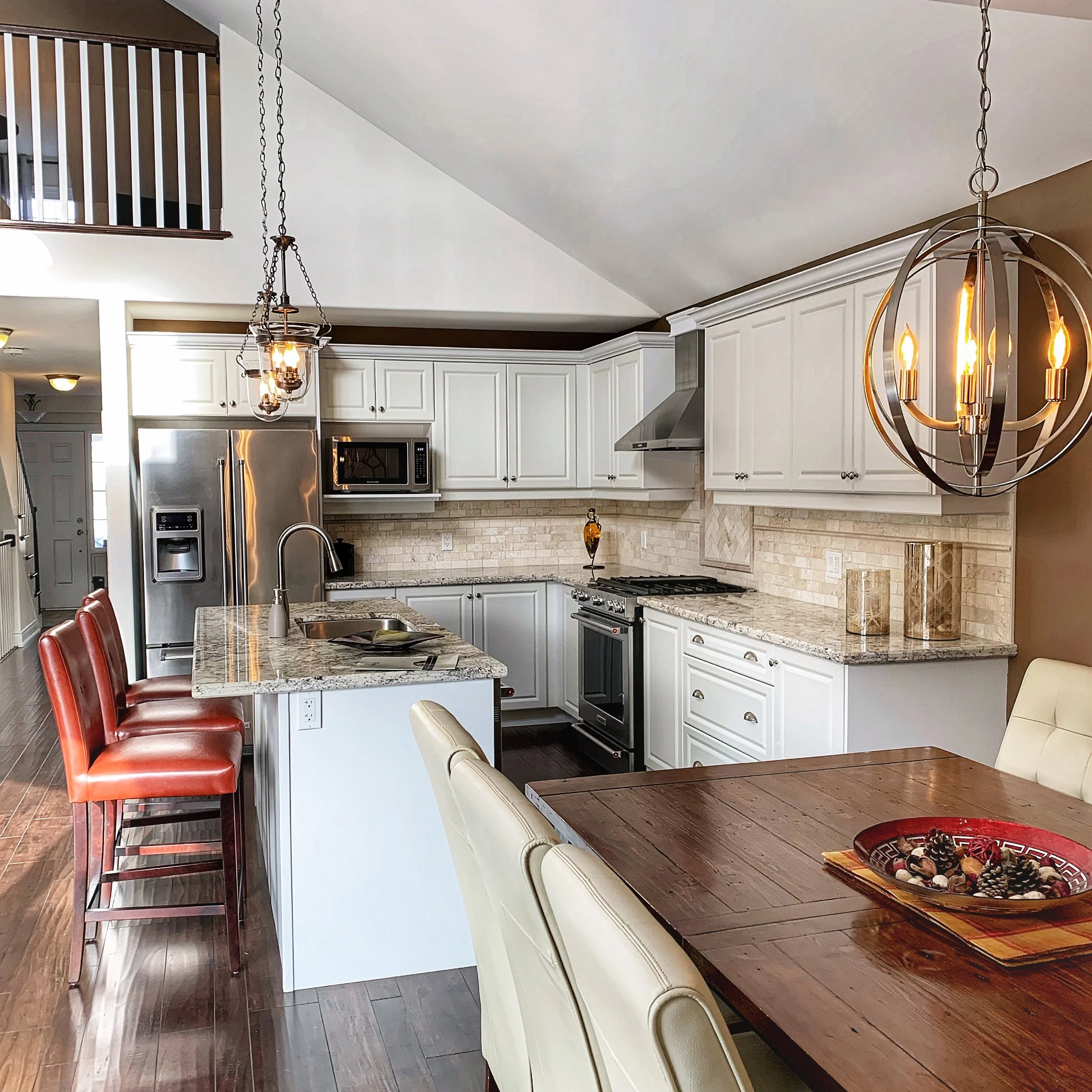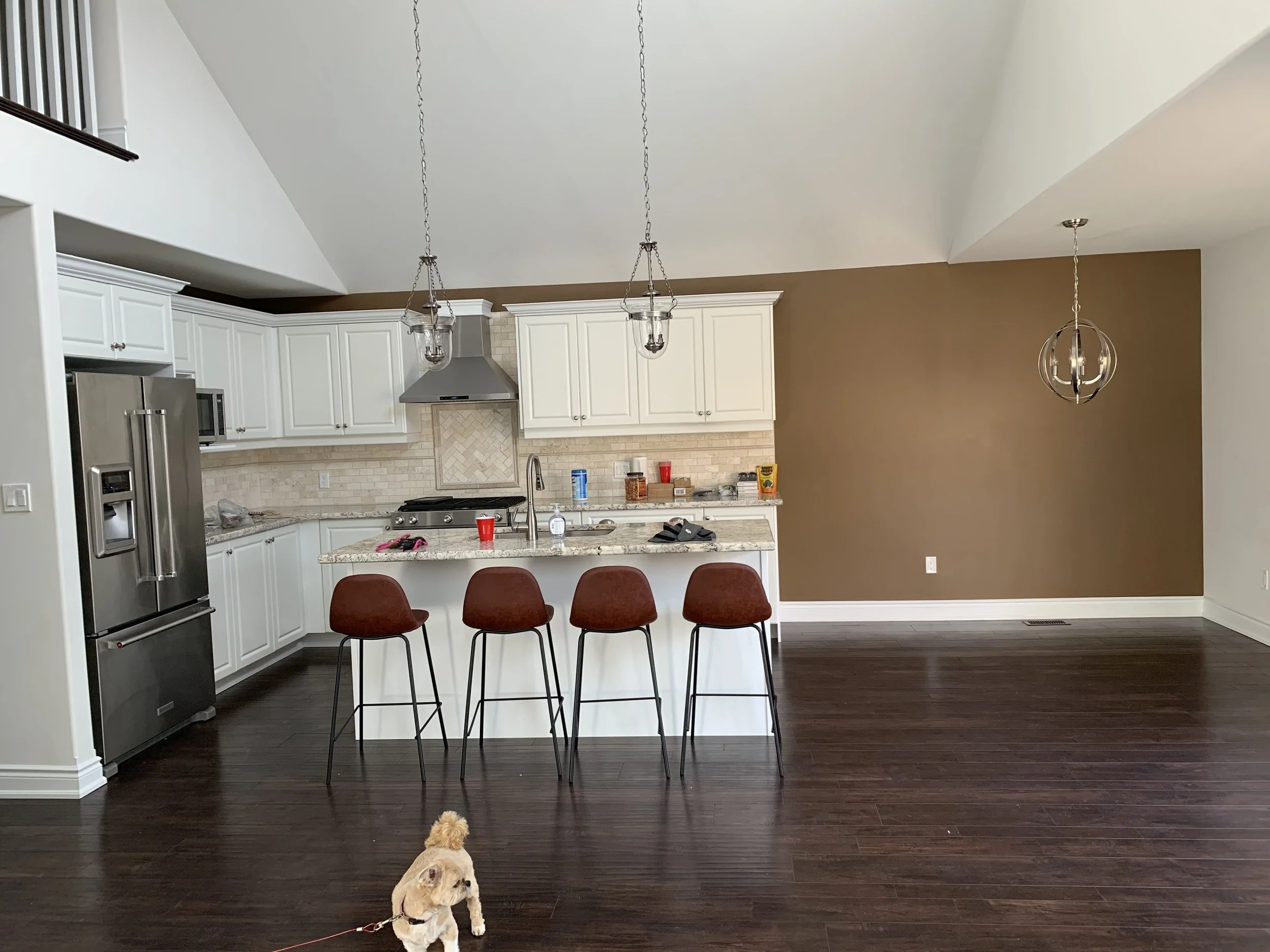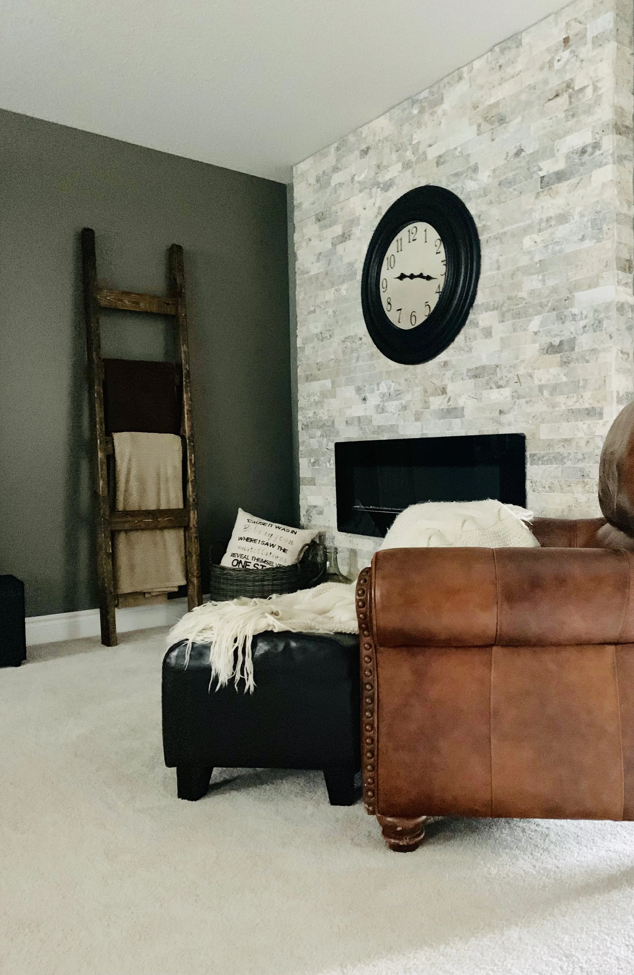 And here is the after, two coats of BEHR MARQUEE® “Limousine Leather”(MQ5-05) and she is stunning from top to bottom! We went on to paint an accent wall in our kitchen in “Limousine Leather” and because we loved it so much and felt like the vaulted ceilings enabled us to go big or stay home, we also did an accent wall in the living room. The rest of this large common space was painted out in BEHR MARQUEE® “Off White”(PPU-73), it has the softest, warmest undertones and compliments the black accents perfectly.