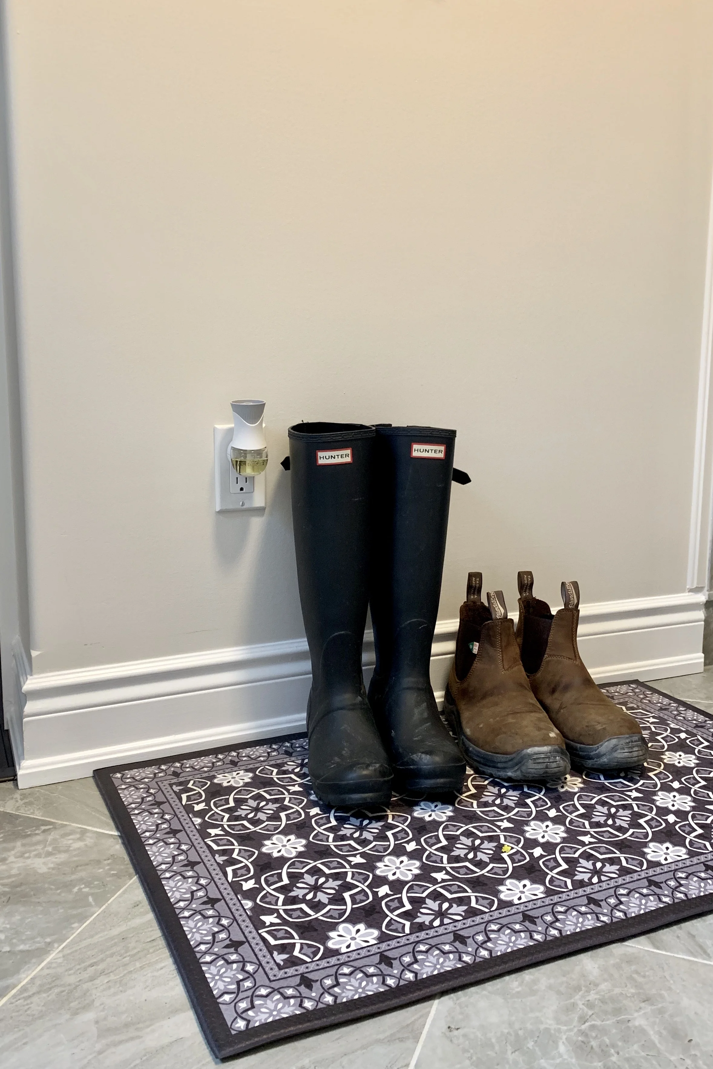 We also used “Off White” in the hallway leading to the front entrance of our home and chose to transition to the darker colour that we used in the loft, above the front door. I think it was the perfect starting point and this rich beautiful colour is BEHR MARQUEE® “Wet Cement” (HDC-NT-23). I love that it pulls both gray and green tones depending on the lighting and time of day. Here are before and afters of these spaces: