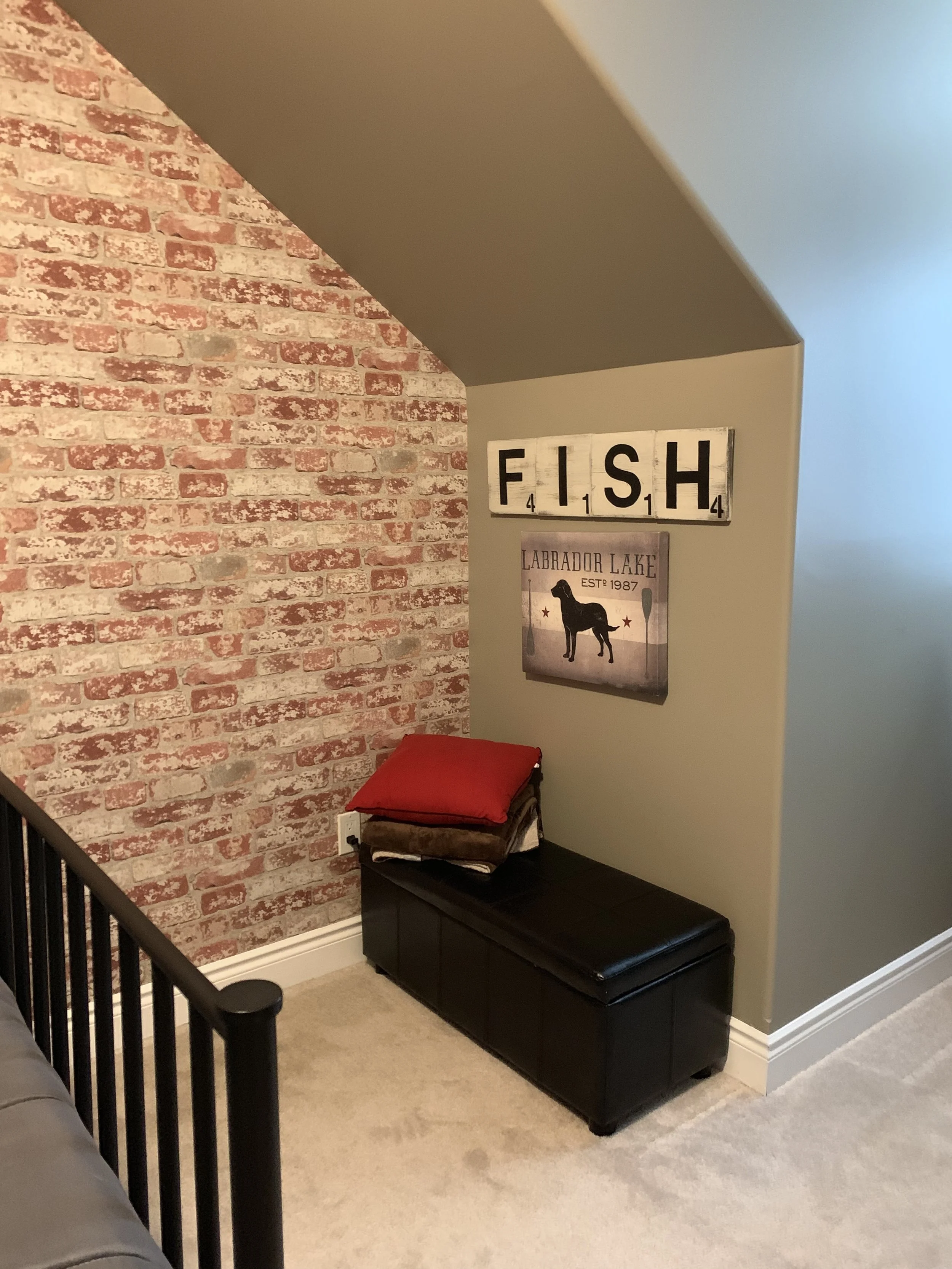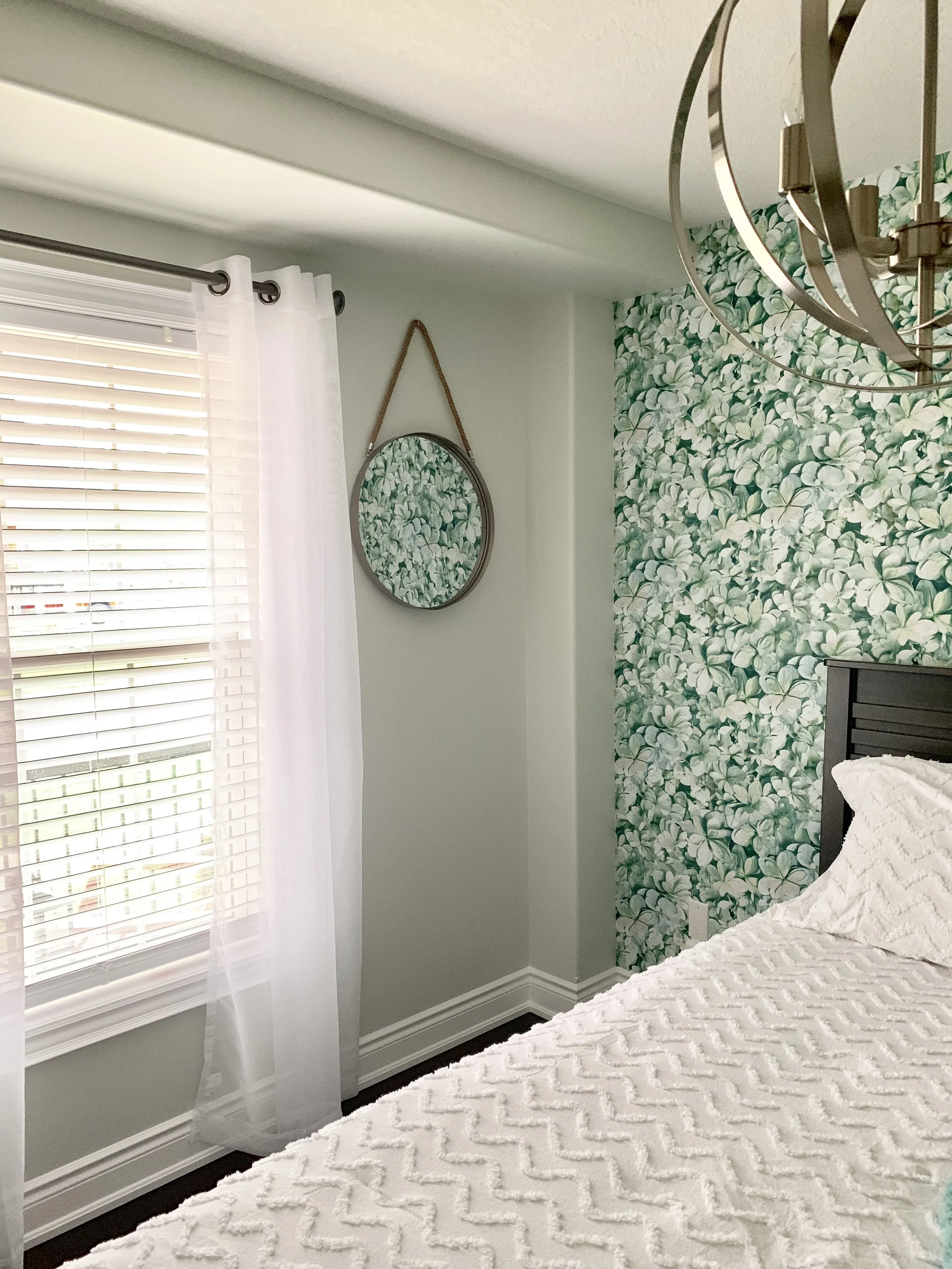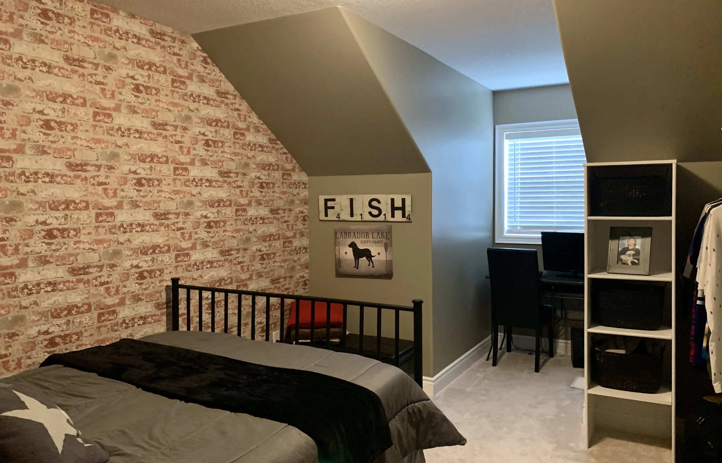 The original owners of this home used the loft space as a master bedroom and the third bedroom was used as a large custom walk in closet. As you saw previously, we are using the loft as a tv/media room and this walk in closet needed to be used as a third bedroom. We removed some of the closet components and transitioned it back into a bedroom for our teenage son. The colour we used in here was a compromise between him and us and is BEHR MARQUEE® “Roadside” (MQ2-52). This bedroom came together better than we imagined when we began this project.