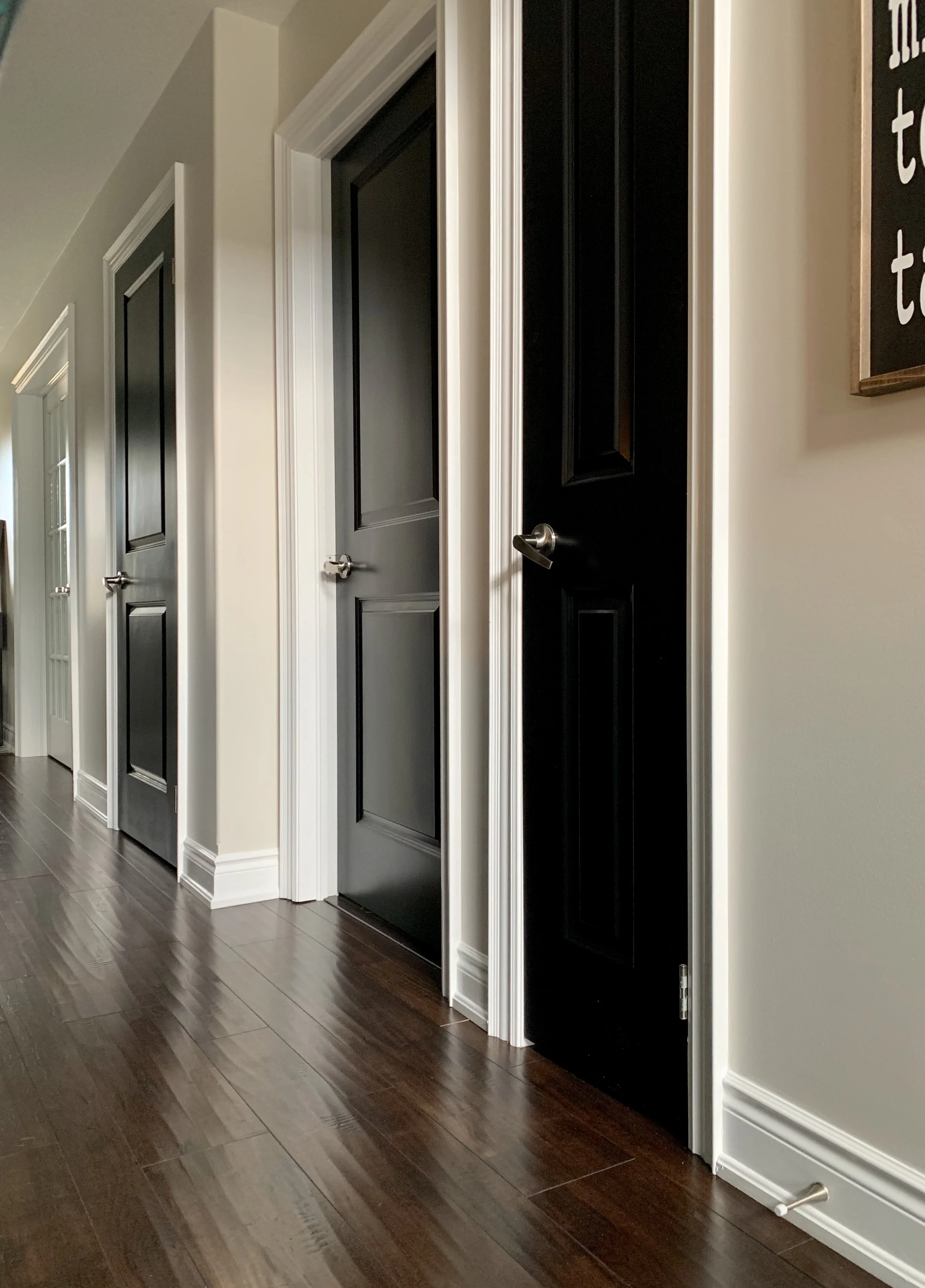 Last but not least we decided to paint our interior doors black. I know what you’re thinking, my husband thought the same thing but they turned out FANTASTIC! We absolutely love them! I wish I could show you them all completed but since I always try to keep things real, I’ll be honest and tell you we still have a handful of doors to complete. And not only that, once they are completed later this week, some are missing hardware that is on backorder until the end of the month. The ones that are done are stunning and are the perfect finishing touch.