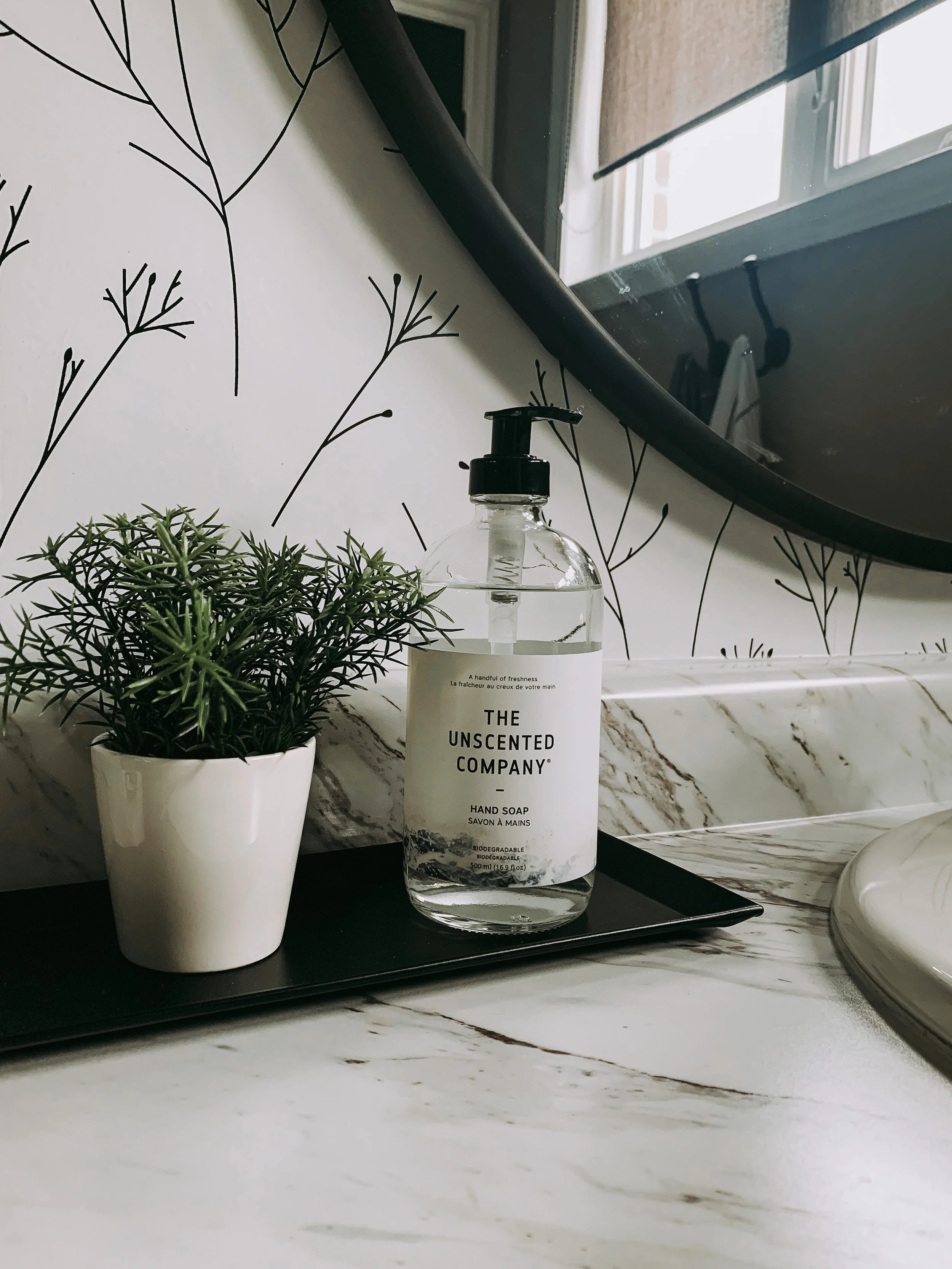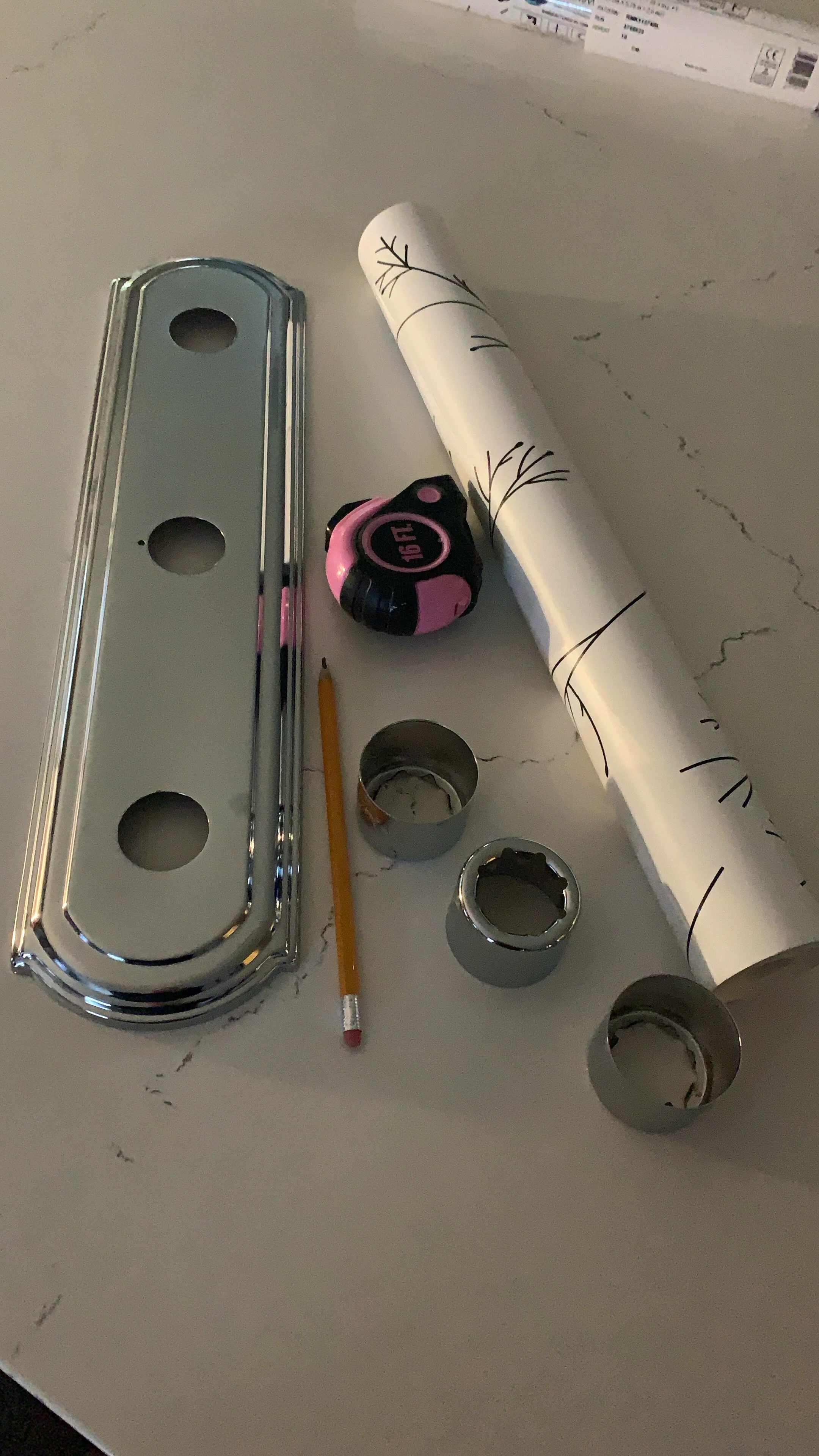 Before I dove into the Zero Dollar Challenge, I headed to the basement (where the unpacking is never-ending), and went through my bins of leftover project supplies, I was specifically looking for peel and stick wallpaper. Luckily I had just enough of a pattern we had used in the Mary Street Flip house in the summer (click here to check out that fun project!) to do one wall in our master bath. Originally I figured I would wallpaper the wall, change out the mirror with one i’ve used in our last two houses (this will be 3!), and paint the light fixture. Of course once I got going, things seemed to snow ball and here is what we accomplished, - keeping in mind everything we used, we had on hand!