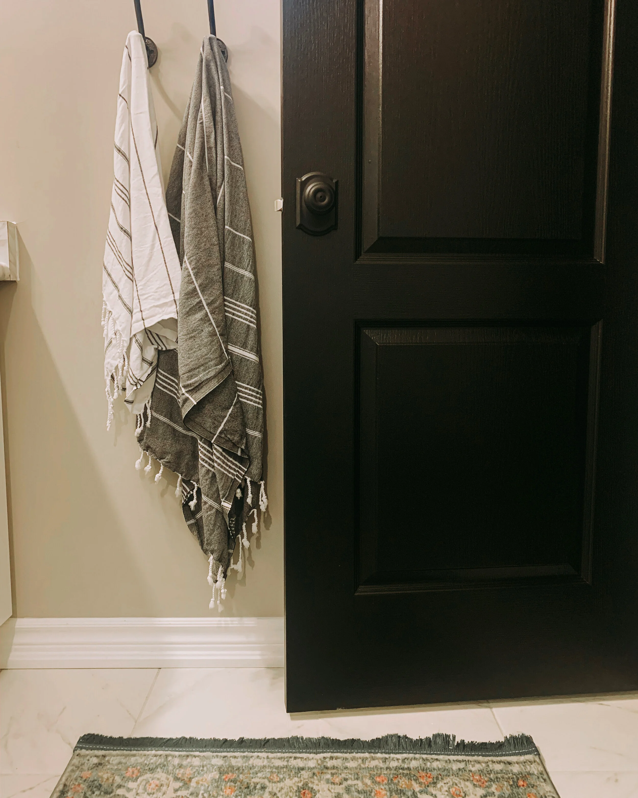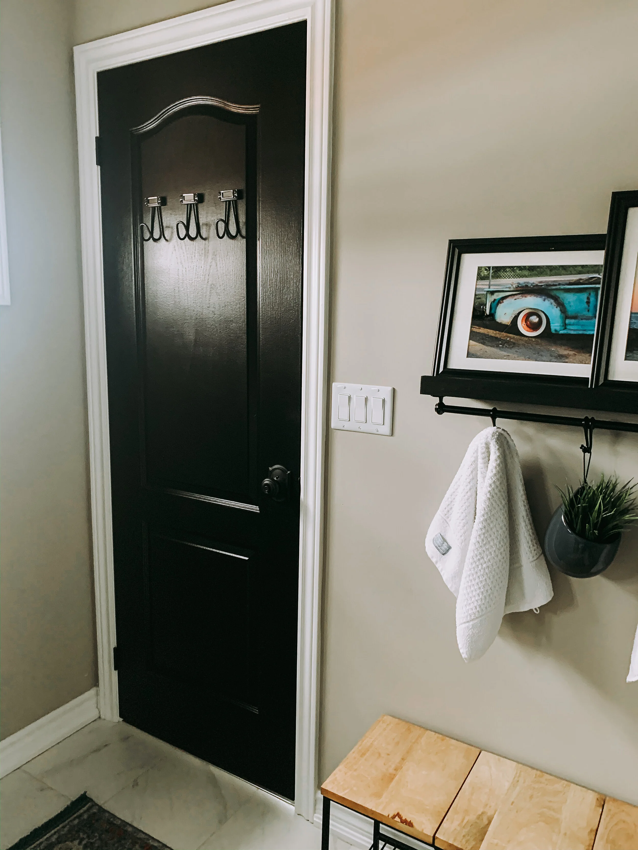 paint bathroom door “Limousine Leather” by Behr in a satin finish & add new matte black Schlage Canada custom interior hardware