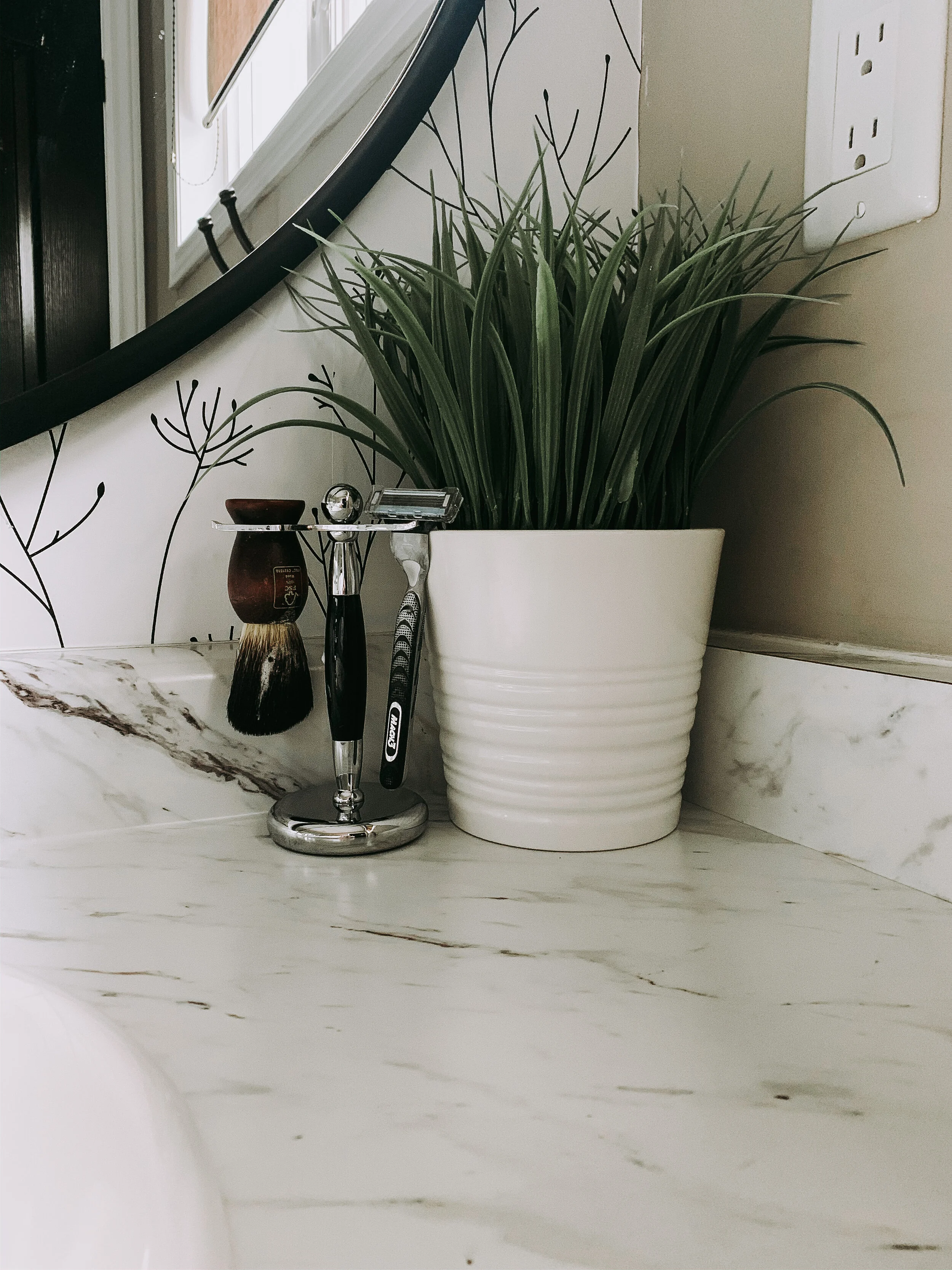 If i’m being honest I was aleady toying the with the idea of wallpapering or painting an accent wall in our master bath because other than the big beautiful shower it was sad and boring. And one day it will be properly updated but for now I just wanted to give it a little oomph.