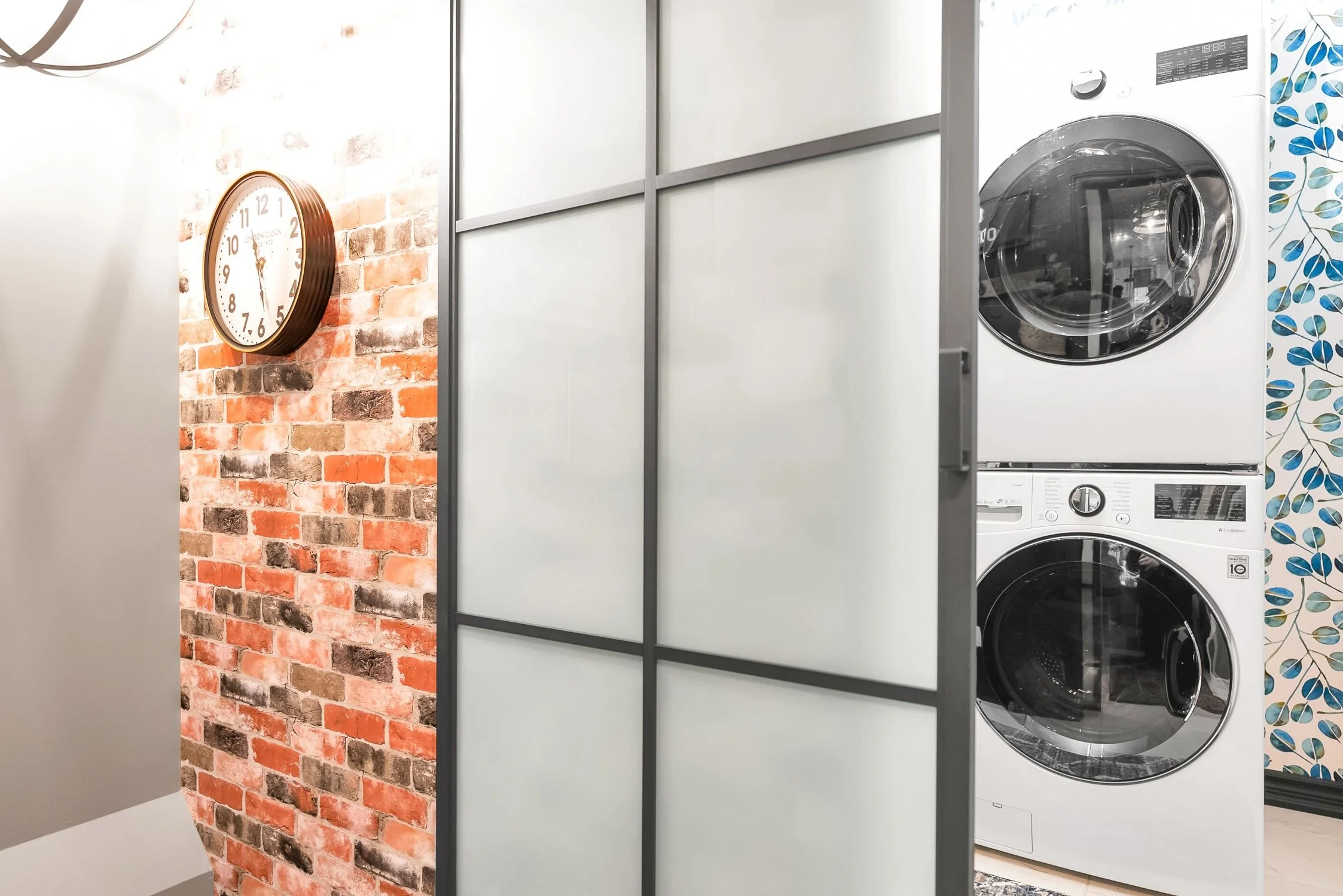 Now that painting, wallpapering and cabinetry install were done, it was time to think about installing our gorgeous barn doors from Renin. You heard me say this laundry room had 3 doors before, not including the door at the other end that goes into our garage - the only door we didn’t remove! This laundry room has no window and the hallway leading to it has no windows so I knew I wanted to bring in as much light as I could. Cue the Tribeca 6 Pane Barn Door Kits. We installed one on the entrance into the laundry room, and one on the closet opening and I am OBSESSED!!!!! Who knew doors could bring so much joy? The door on the closet purposely doesn’t cover the entire opening, that’s exactly how we wanted it. We can still easily access the whole closet, even stepping inside it, with the door as it is. We used a Diamond Bit to drill into our ceramic tiles to install the door guide….the first time we had ever done something like that! It was stressful but my husband, like always, watched a You Tube video and got it done. These Tribeca doors are also available in an 8 Pane style and available at multiple locations but most affordable at Costco Canada online!