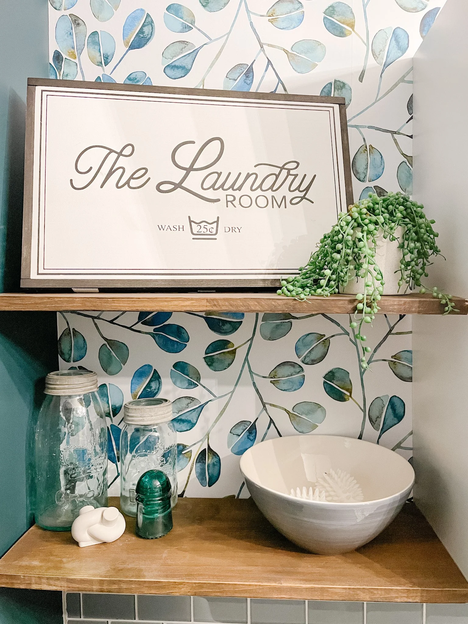 Cue the Fall One Room Challenge. Design plans were made, Partnerships secured and we got to work. We removed doors, we stripped wallpaper and started painting while awaiting delivery of our peel and stick wallpaper from Roommates Decor. I chose the paint colour based on my original wallpaper choice. I used “Thermal” by Behr in their new Dynasty paint finish. Great coverage, super durable and scrubbable. Unfortunately after the paint was on the walls I was notified by Roommates that my wallpaper was no longer available. This could only happen to me! They kindly gave me the option to pick a second choice….which I had to do quickly, online, with no samples, while trying to match to the paint colour already on the walls! I ended up choosing the Cat Coq “Eucalyptus” in teal. It’s a great match, but I’m still pining over my original choice. What I love about the original paper I chose is the green tones in the pattern and the old world feel. BUT, not one to cry over spilt milk, I’ve embraced this pattern and it’s definitely a fun print for a laundry room.