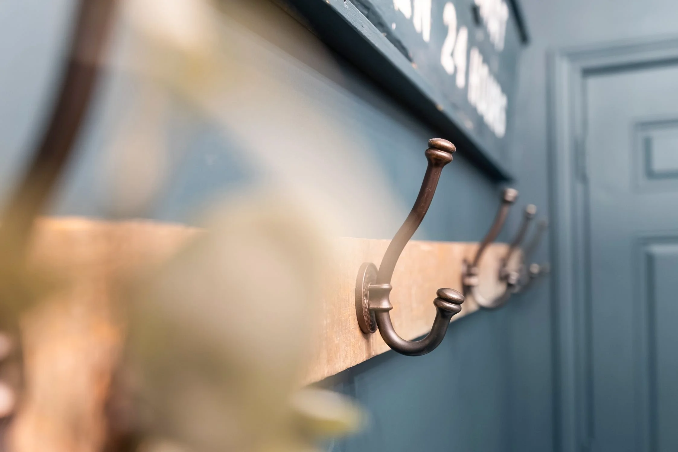 Now it was time for the fun stuff - caulking, trim, opening shelving that we reused from the laundry room glow up. We cut a length of pine in half and used my go to “L” brackets. They give your shelves the look of floating as you can hide the brackets with whatever you are putting on your shelves. We also reused a piece of barn board and hooks we have had in the laundry room since we moved in, because waste not want not right?