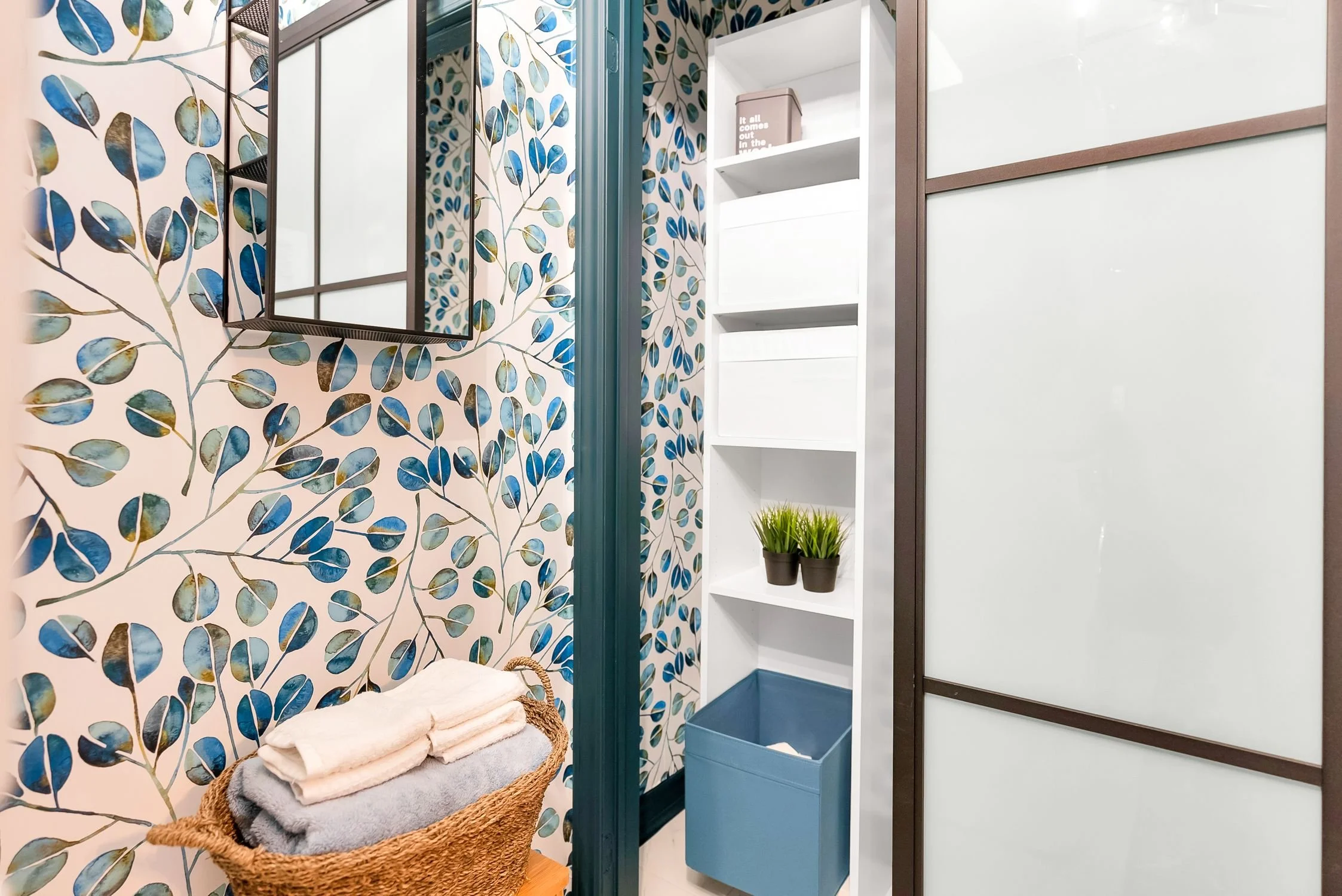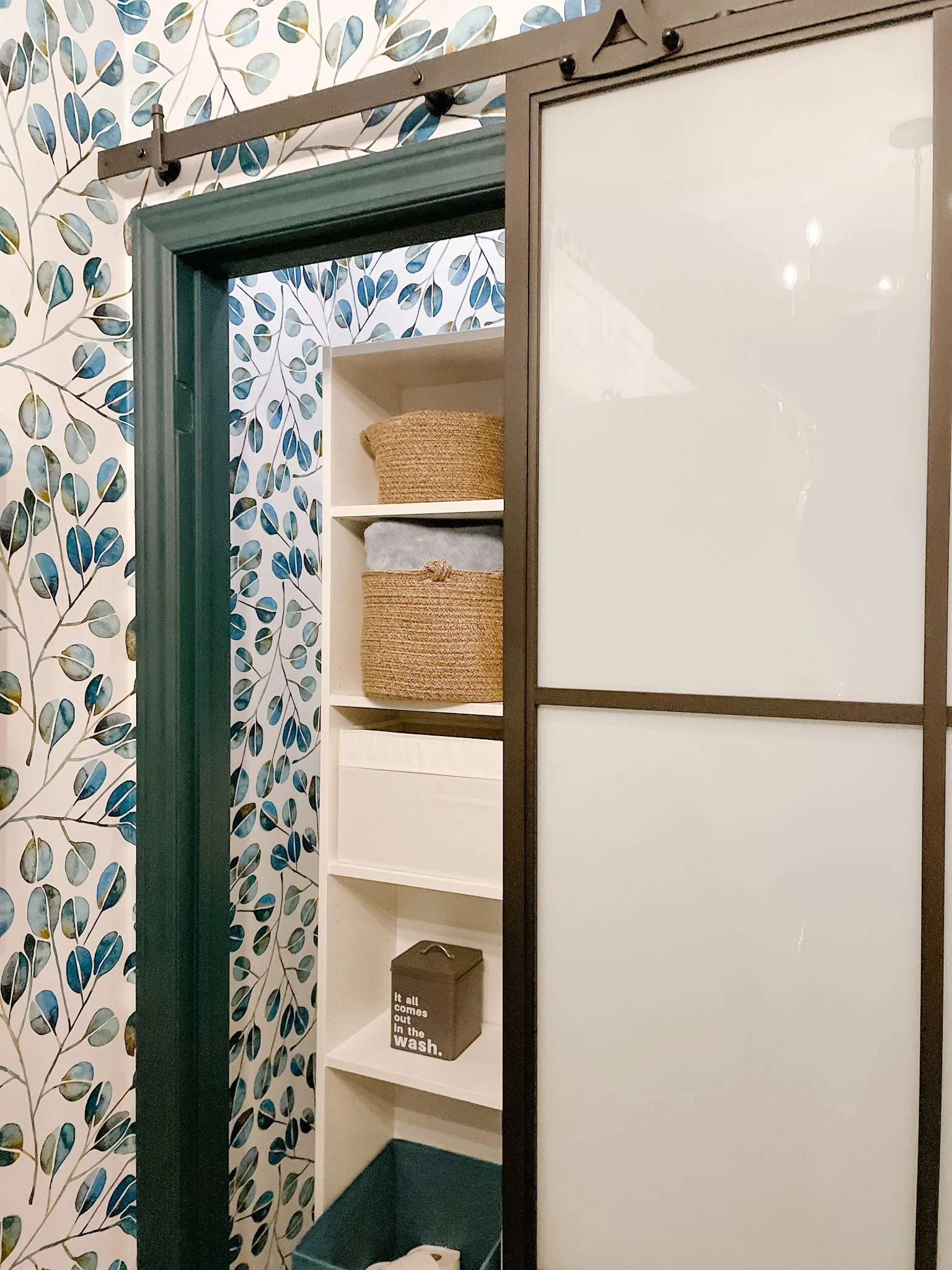 Now it was time to finish the wallpaper on the accent wall and I even wallpapered inside the closet. The closet that didn’t get totally finished in time thanks to backordered products and delayed deliveries, will be a functional linen closet, laundry storage and drying racks. It’s going to be a highly functional closet at last!