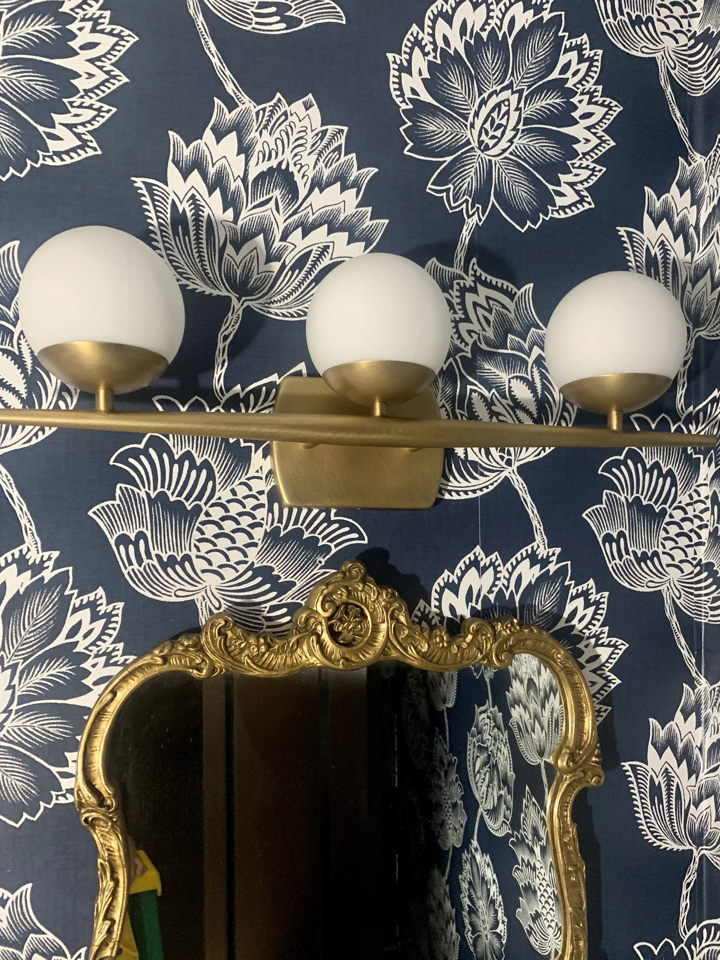 Our 2nd One Room Challenge was in our current home where we turned a boring builder grade bathroom into a fun, bold, vintage inspired space. This”Jasper” fixture by Kichler was made for this bathroom, I love it so much! Click here to check out the total transformation of this space!