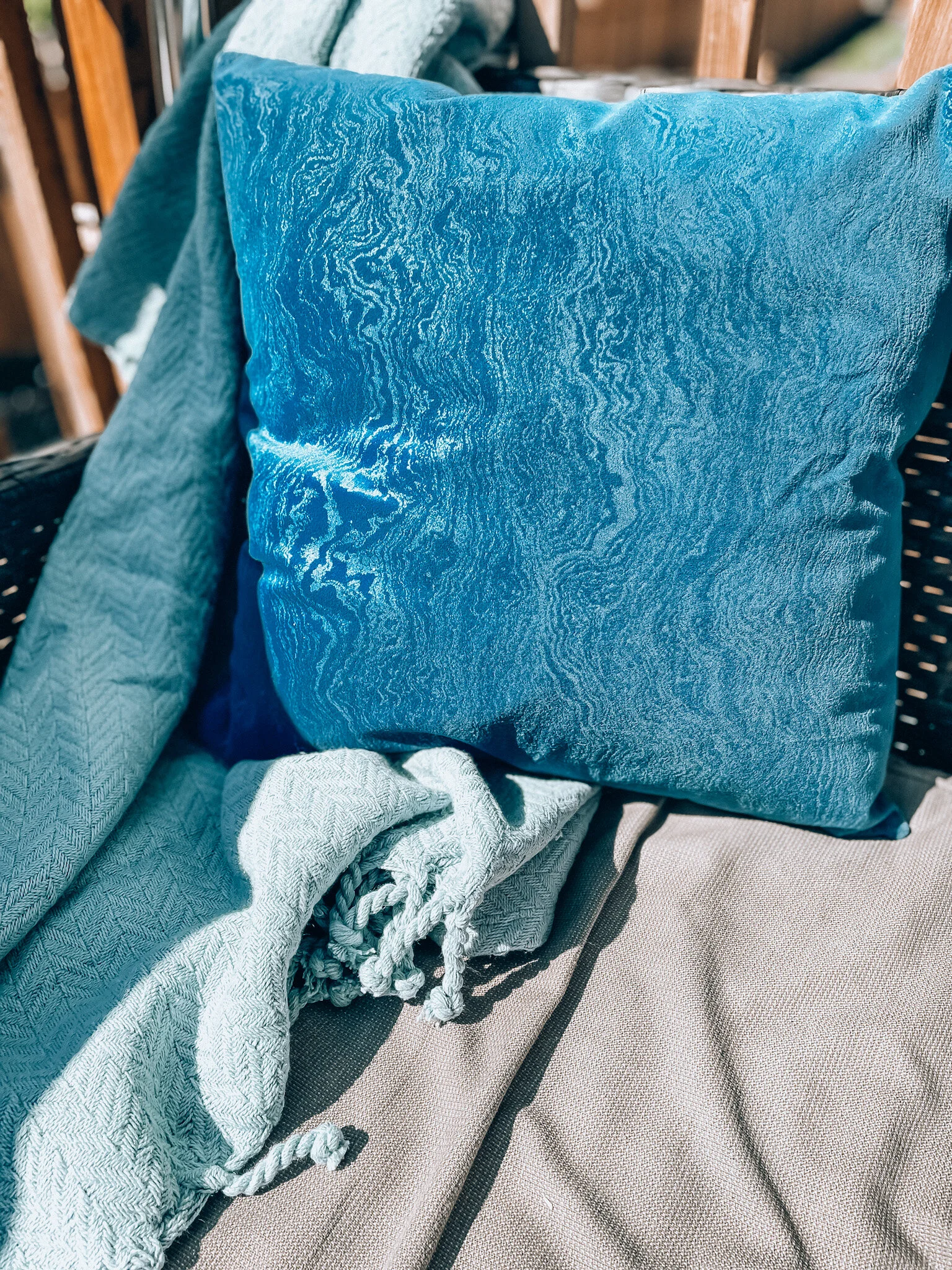 I started out by weather proofing the two pillow covers I snagged on Wayfair with my go to Scotchguard Spray by 3M. You can basically turn any of your indoor pillows into outdoor pillows with this spray - linked in my Amazon shop for your convenience (click here).