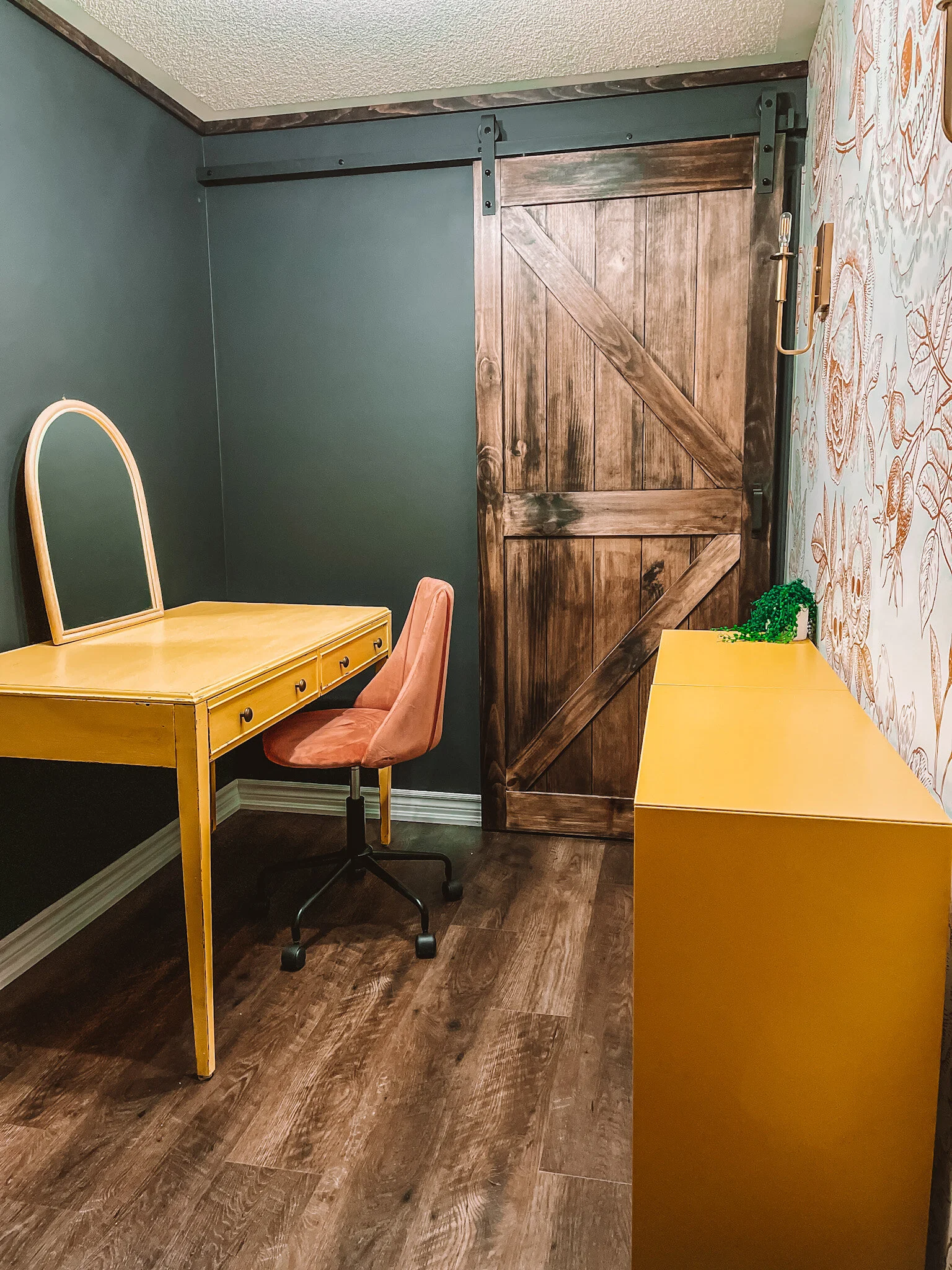 We have painted, laid vinyl plank flooring, hung a mural , hung a barn door, replaced lighting. And in absence of the gorgeous area rug that is en route for this space, let’s instead talk about furniture!