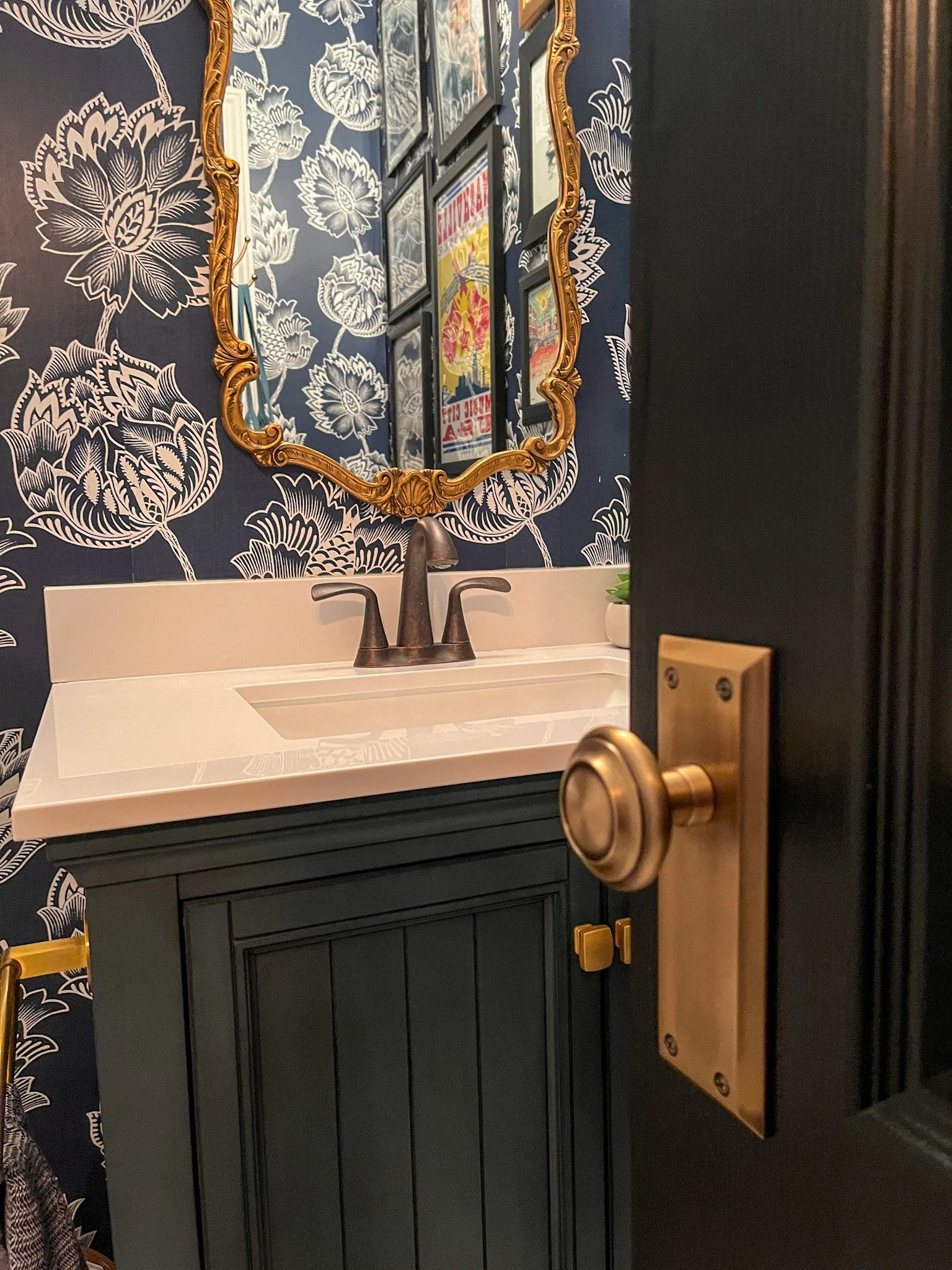 I also LOVE how our new Grandeur Hardware shines on our guest bathroom door, fitting in perfectly with all the existing brass accents. A match made in heaven.