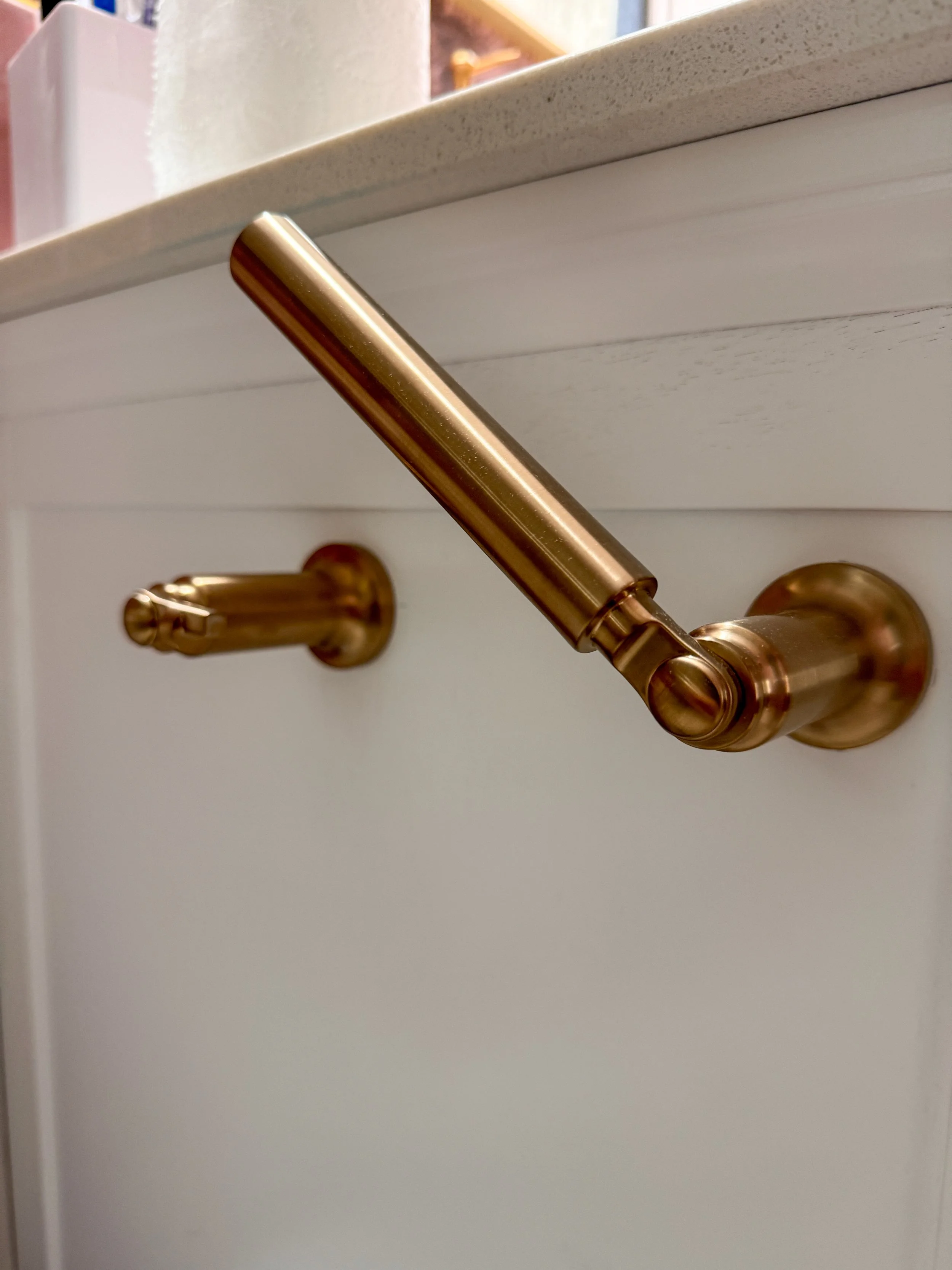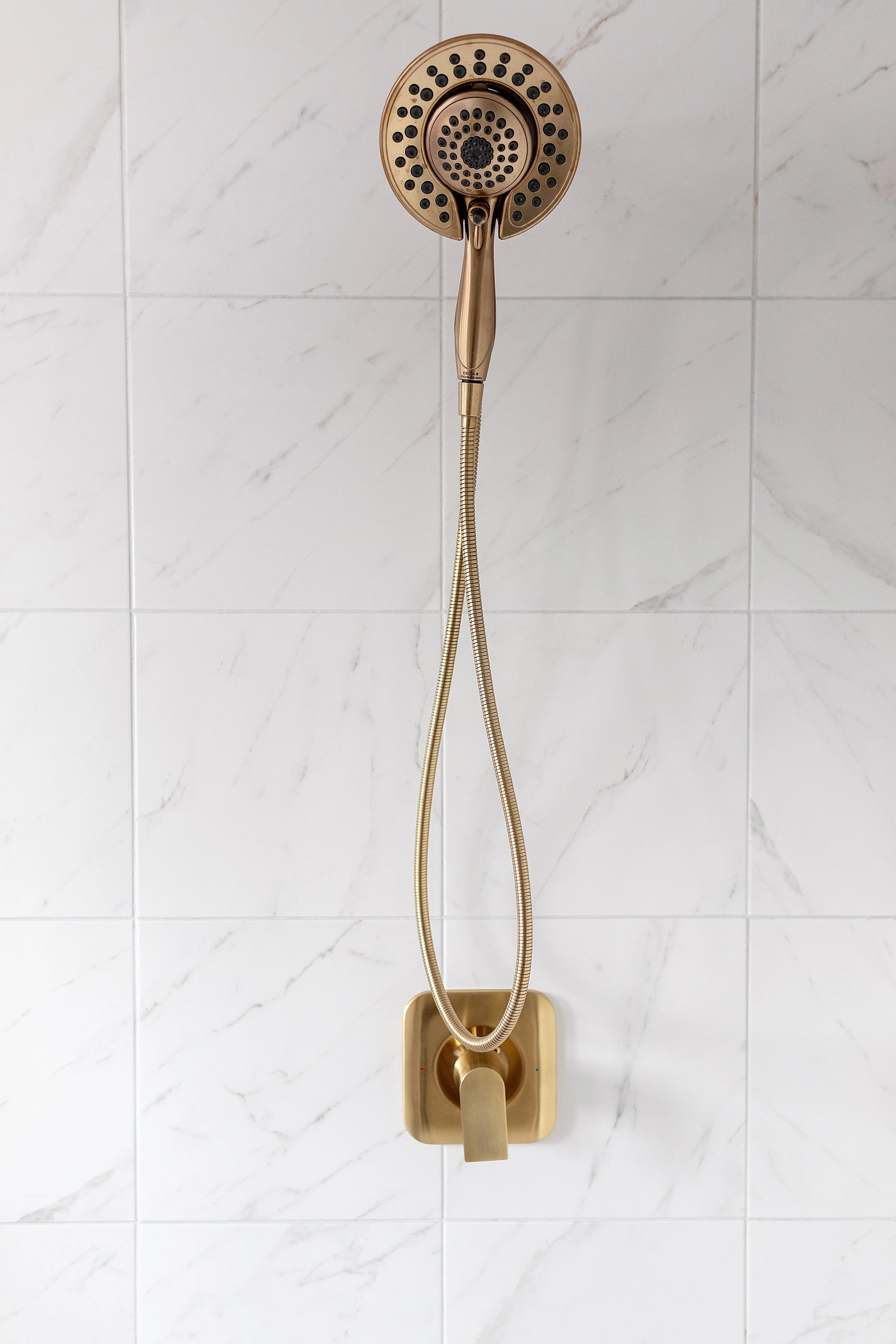 Next we installed the Saylor Monitor 17 Shower Trim with In2ition, also in the beautiful Champagne Bronze finish. What I love most about this shower trim is we can use the shower head and handheld shower together or seperately. This integrated dual functionality is a win as you can also change the volume and use the pause button which gives you time when shaving and/or lathering and allows you to easily restart the water without a change in the temperature. This shower trim kit is perfect for showering children or loved ones, even dogs! It also makes cleaning easier. It is backed by Delta’s Lifetime Limited Warranty which gives it a 10/10 in our book!