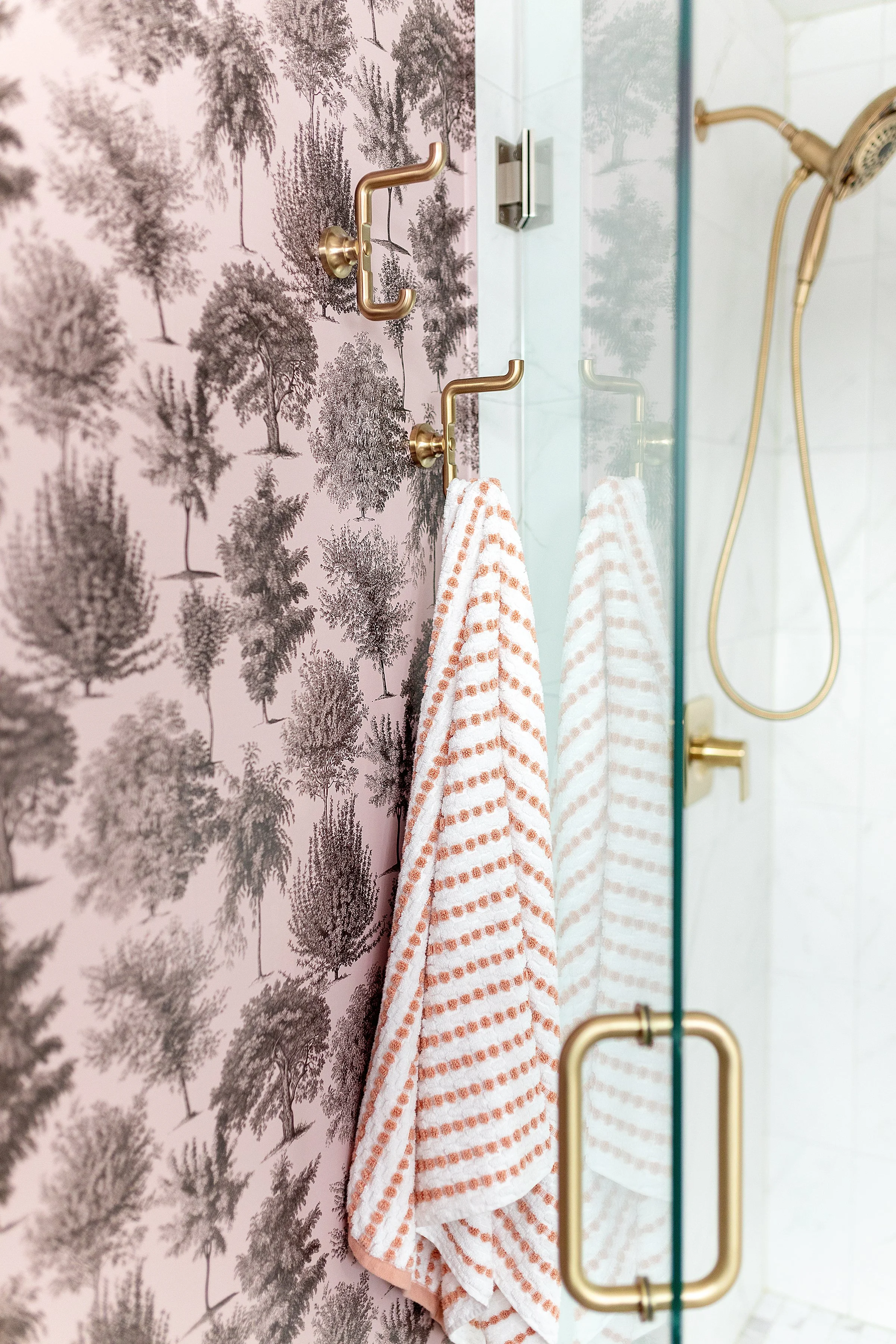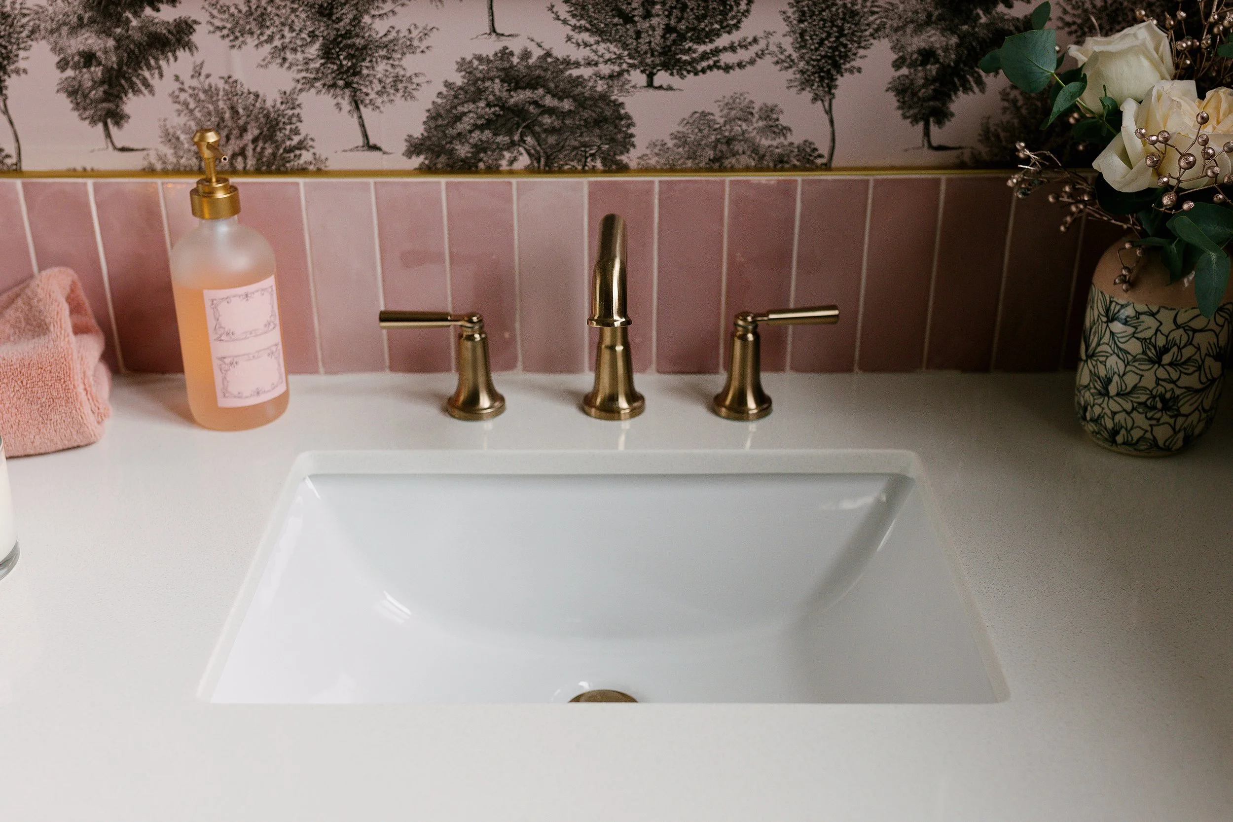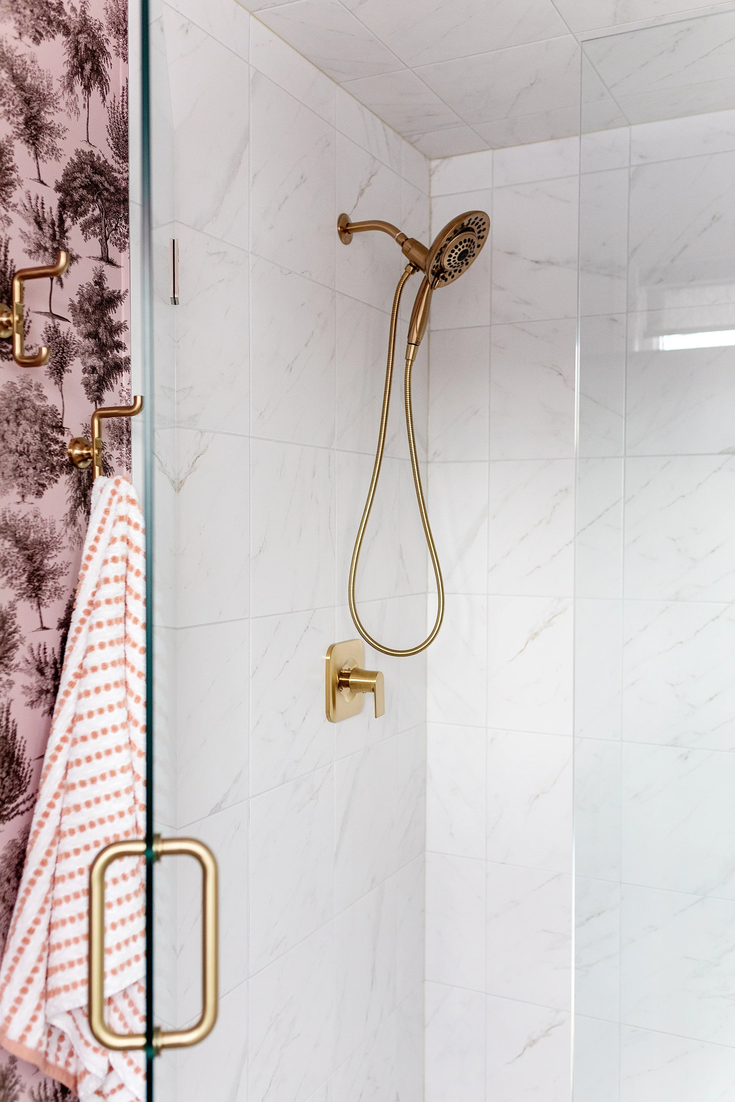 I often get asked how I formulate a design plan and I never have a true straight answer. But in this project, I can honestly say, it all started with some pretty pink tiles that I fell in love with and knew instantly, they needed to be paired with Champagne Bronze fixtures from Delta Faucet.
