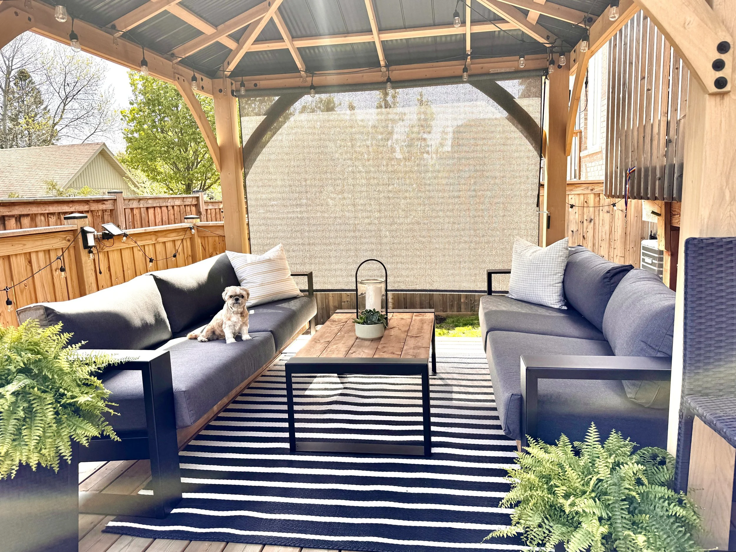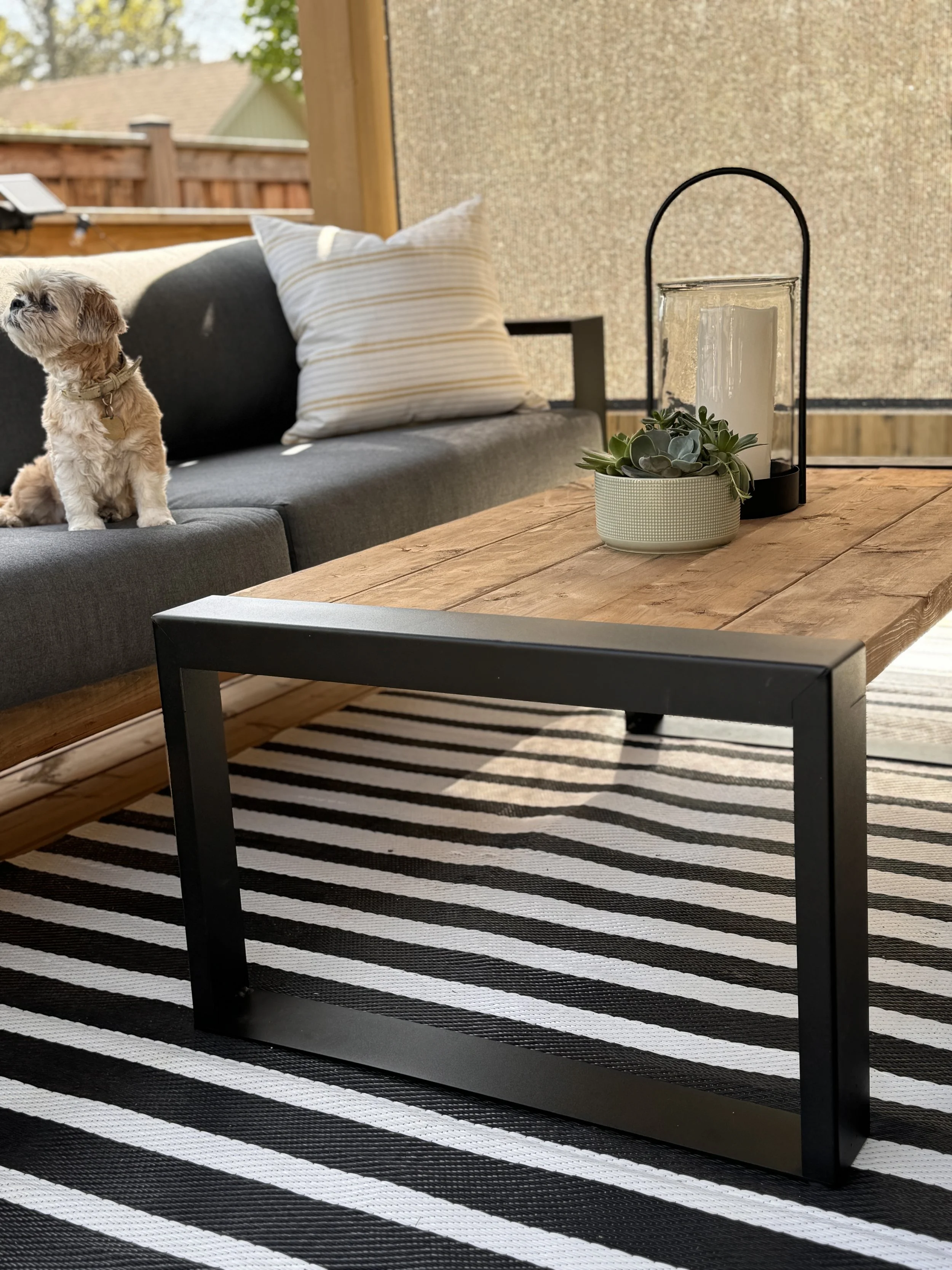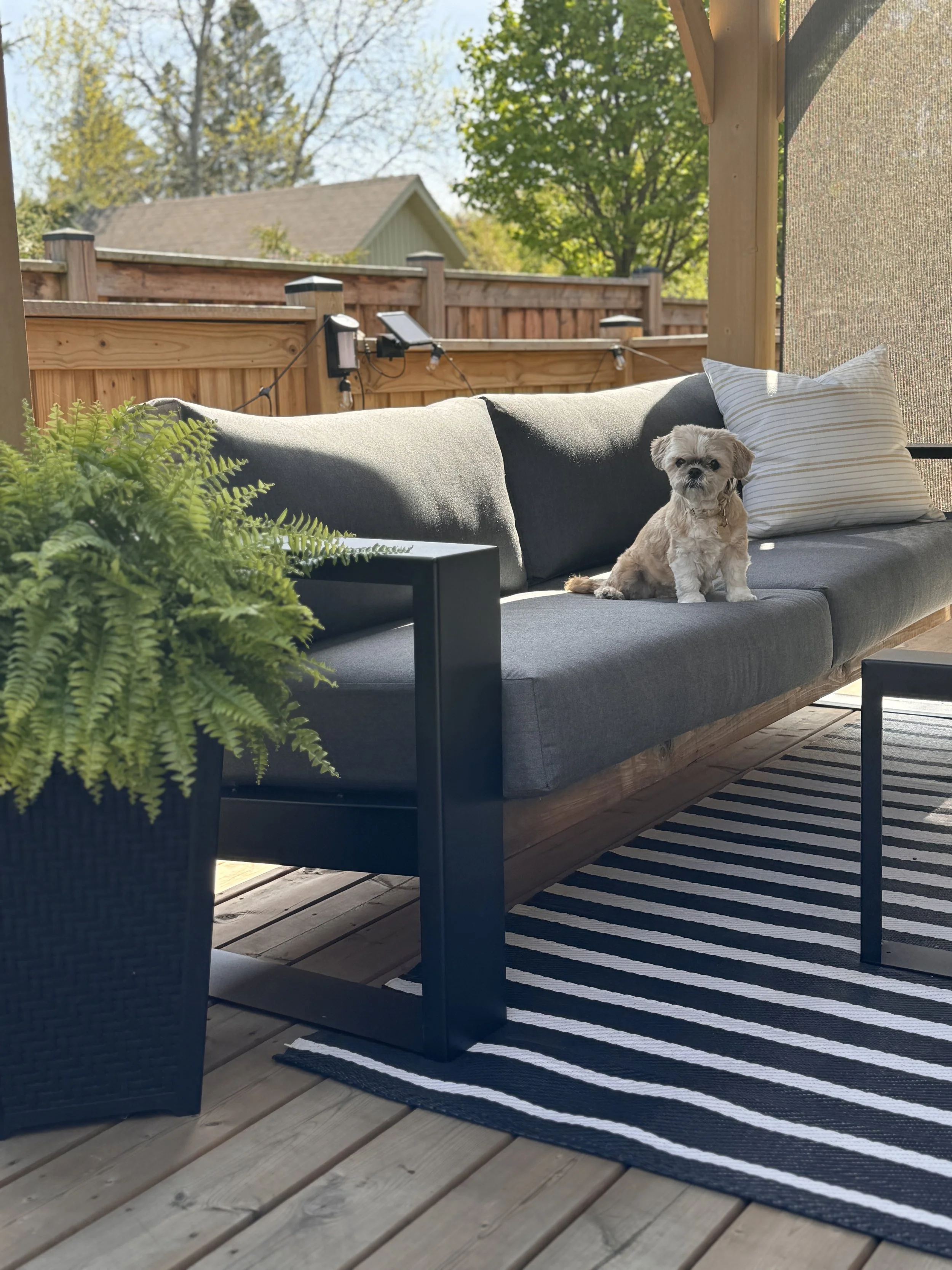 Fast forward to this spring which had us building two Modern Muskoka couches and a coffee table for our deck right here at home. We paired them with the Toja Grid cushions in charcoal (custom made with Sunbrella fabric), and the set has completed our backyard oasis.